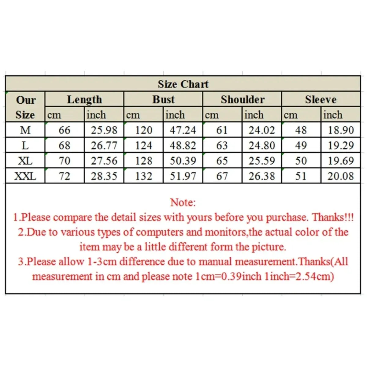 - XXL: Length: 73cm, Bust: 134cm, Shoulder: 65cm, Sleeve: 60cm