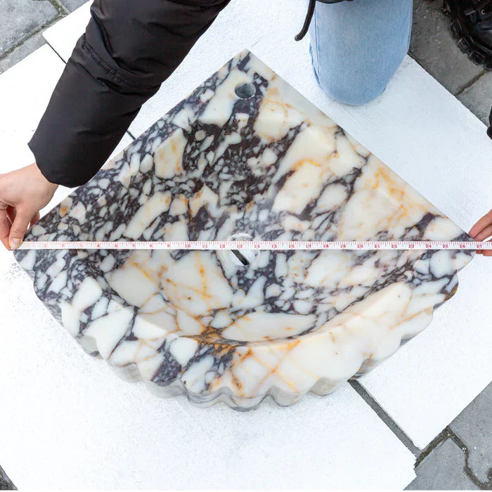 Calacatta Viola Marble Wall-mount Bathroom Corner Vanity Sink Ribbed (W)20" (L)20" (H)7" is hand-carved from Solid Block is handcrafted in Turkey.
