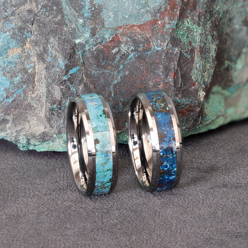 Elegant and durable, our CALYPSO Tungsten Wedding Band showcases a stunning Chrysocolla inlay for a unique, eye-catching touch. A timeless symbol of your love.