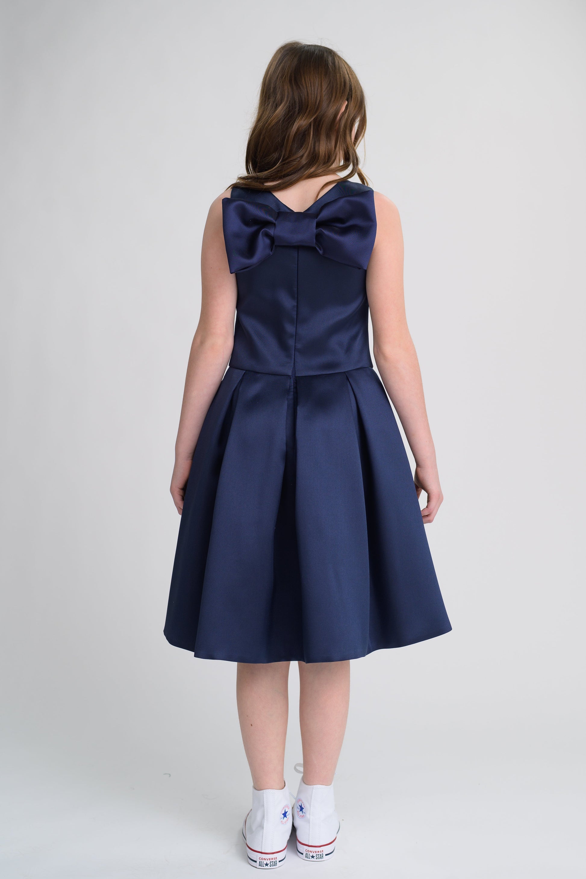 - Satin high-low dress with bow on back.
