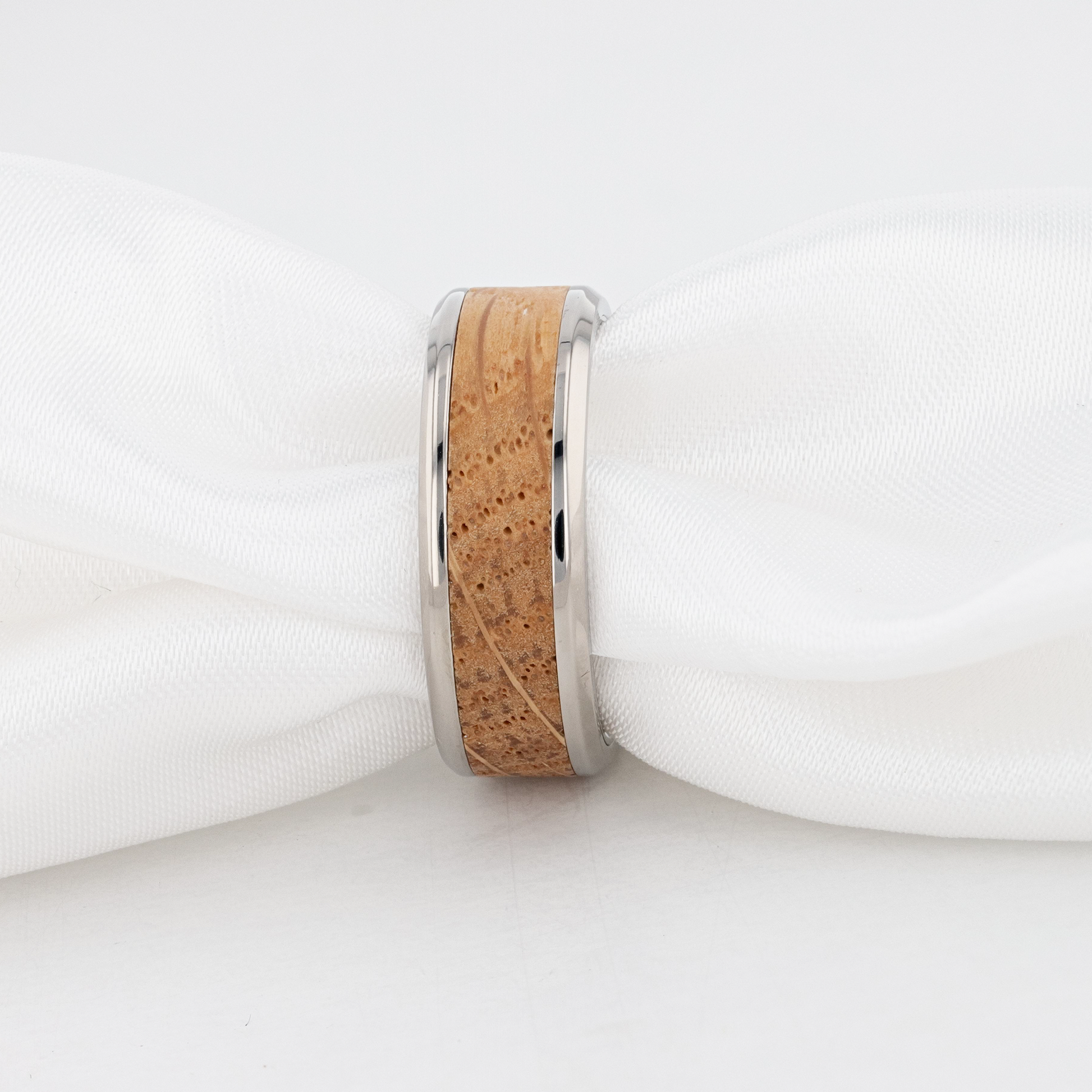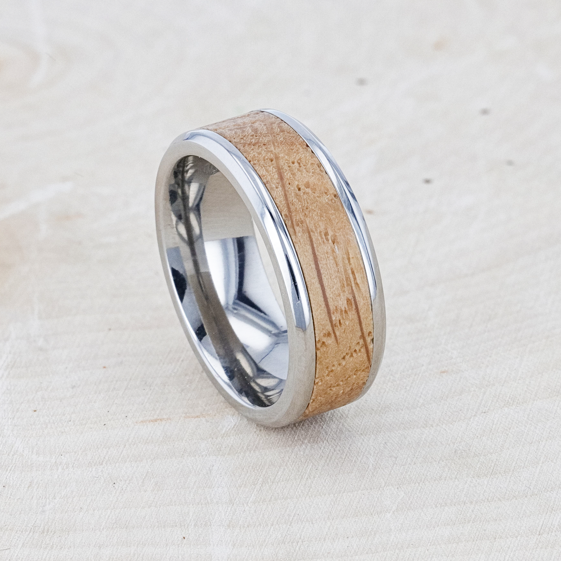 CASK Whiskey Barrel Inlaid Titanium Men's Wedding Band With Beveled Polished Edges Made From Genuine Whiskey Barrels - 8mm