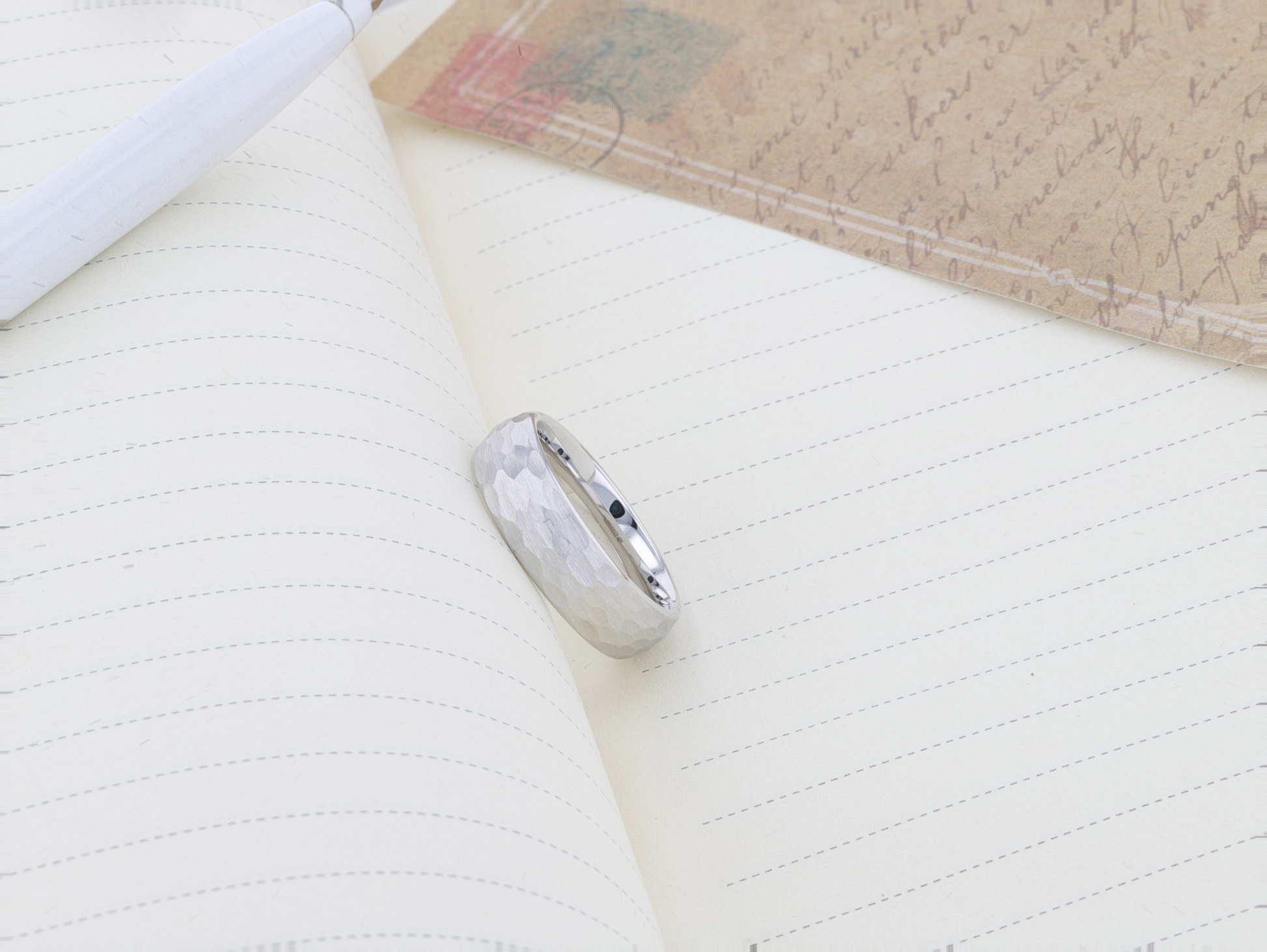 This beautiful White Tungsten Carbide wedding band design by Thorsten features a domed profile with a beautiful hammered finish all over its surface and can be worn as a wedding band or promise ring.