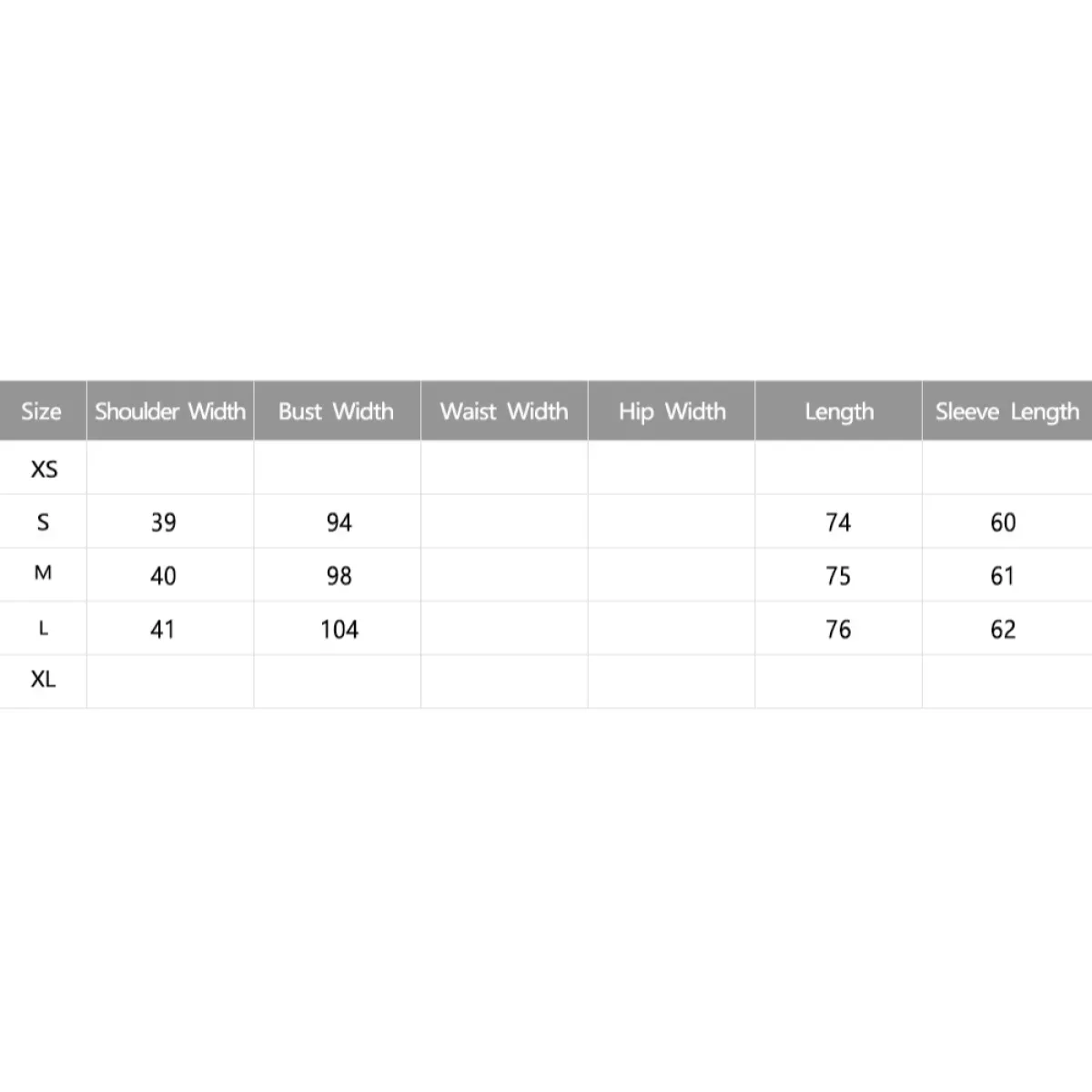 Size | Shoulder Width | Bust Width | Length |