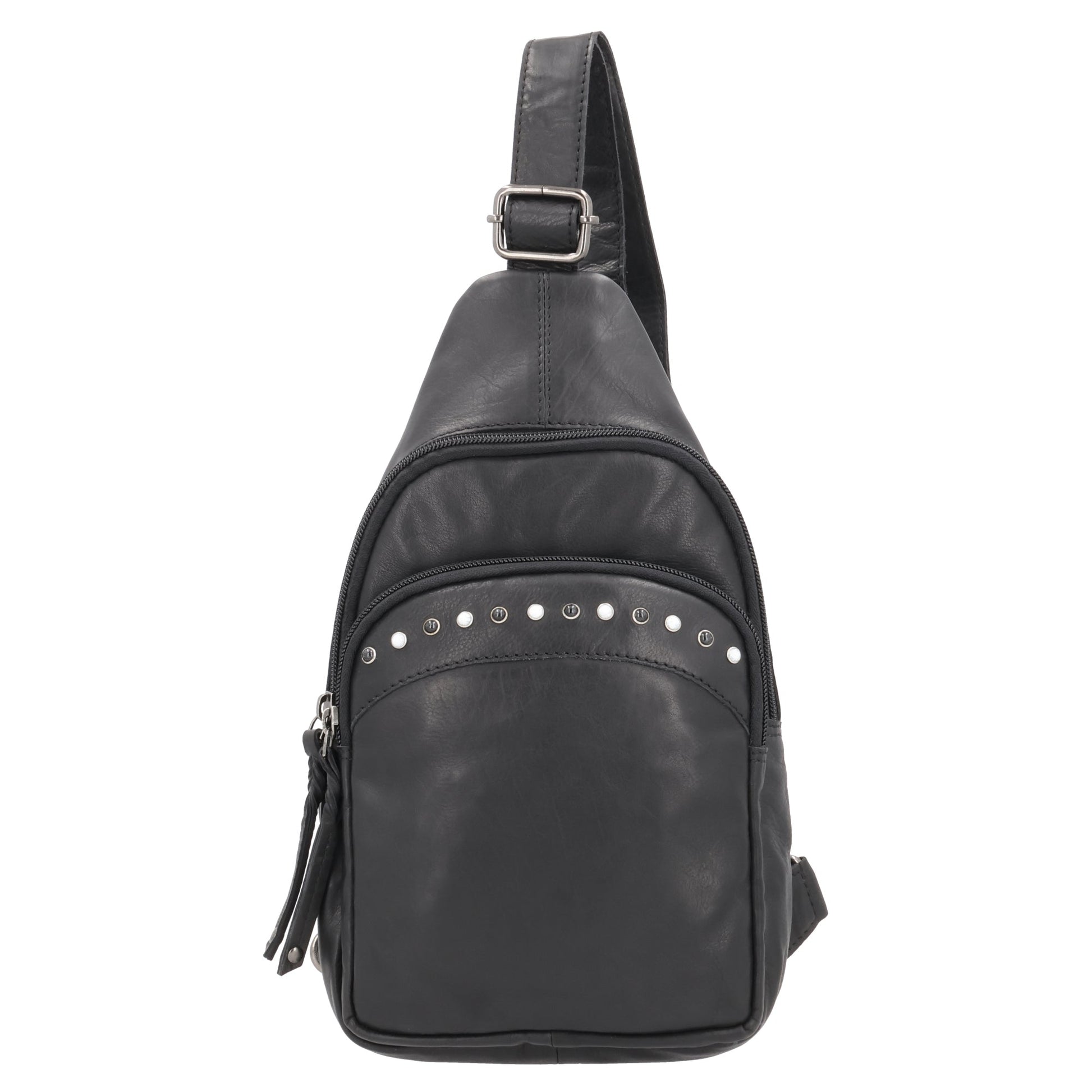 The Haven Sling Backpack by Lady Conceal is crafted from soft full-grain leather, ensuring style and functionality. The decorative studs add a touch of flair to its design. This versatile sling backpack features rings on the lower bottom for ambidextrous carry and can also be worn in the front for maximum firearm security. The main interior has two full-length open slip pockets, a zippered privacy pocket, and a key strap, while the front pocket includes an RFID-protected organizer with four credit card slots and a zipper pocket. Additionally, a full-length back slip pocket offers extra storage options. The adjustable sling strap measures 26" - 49" L (drop 17" - 28.5") by 1.25" W, providing customizable comfort and fit.