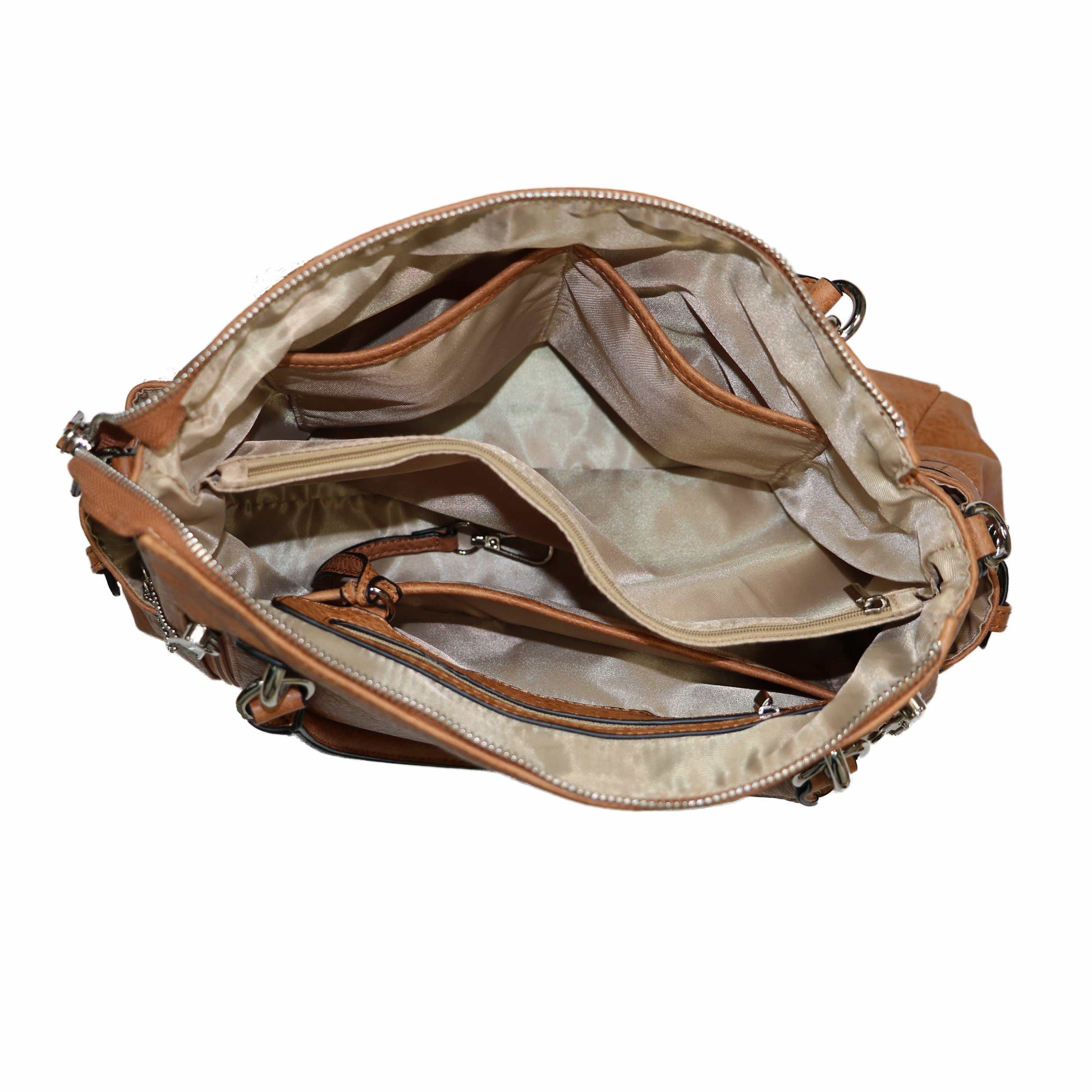 The concealed carry Jessica purse by Lady Conceal is made from soft faux leather, offering ample storage with gathered pockets on each end, a front zippered pocket, and a spacious divided interior. It features two open slip pockets in the front compartment, a zippered pocket in the back compartment, a large open pocket for daily essentials, and a leather key strap. The adjustable crossbody strap easily clip on and off and measures 28”- 49” by 1” (drop 12” - 24”). The double handles measure 18” long with a 6.5” drop. The purse features silver-tone hardware throughout and 4 bottom studs for stability.