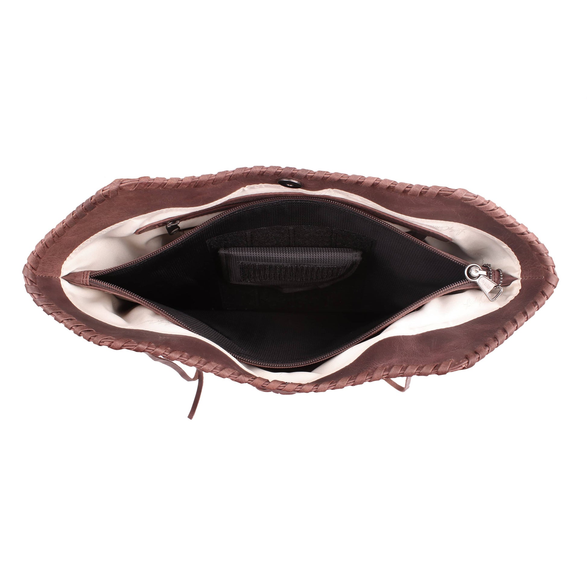 The Kendall Stitched Tote by Lady Conceal showcases premium distressed leather with intricate lacing and stitching for added beauty. The spacious interior fits your laptop, planner, workout clothes, and more. This tote offers discreet concealment with a locking gun pocket in the center, ensuring easy access to your firearm without visible zippers, maintaining your privacy. The interior is divided into two parts by the concealment pocket. The front has two slip pockets, the back has a zip pocket, a large open pocket, and a leather key strap for immediate access, all secured with a magnetic closure. The back has a zip pocket, and each end has open slip pockets for your cell phone or essentials. The sturdy handles measure 27” long with a 13” drop.