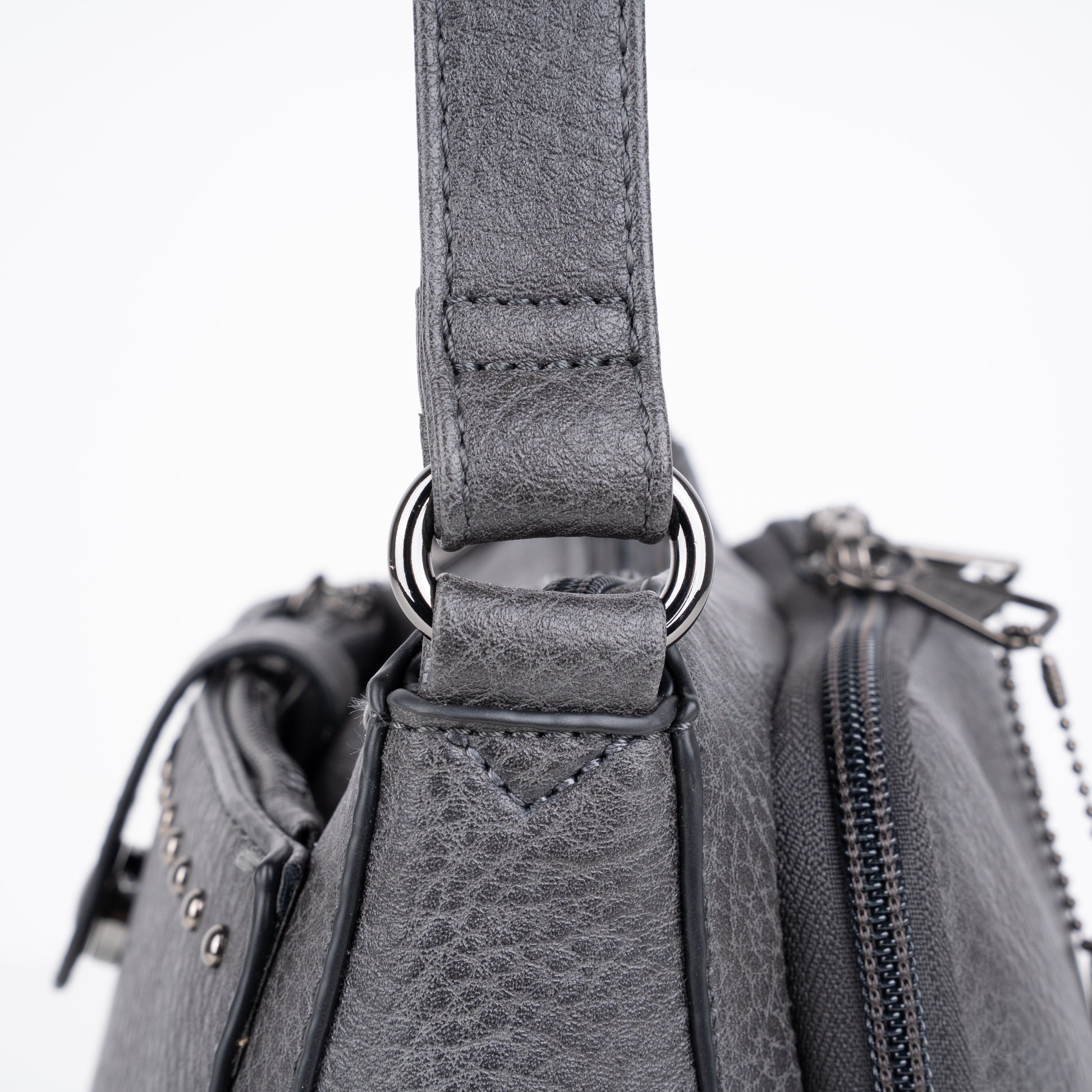 The Kinsley Crossbody by Lady Conceal is crafted with premium faux leather. The bag is highlighted with light sprinkling of studs. Inside the front pocket, secured with a snap closure, is a slim wallet. This RFID-protected wallet has 2 ID holders, 10 credit card slots, 2 open slit pockets for bills, and a full-size zippered pocket. The main interior is divided into two parts by a full-length zippered pocket. The front compartment features two open slip pockets, the back compartment has a zippered pocket, a large open pocket, and a key strap. The adjustable crossbody strap measures 27”- 52” by 1” wide (drop 12” – 26”).
