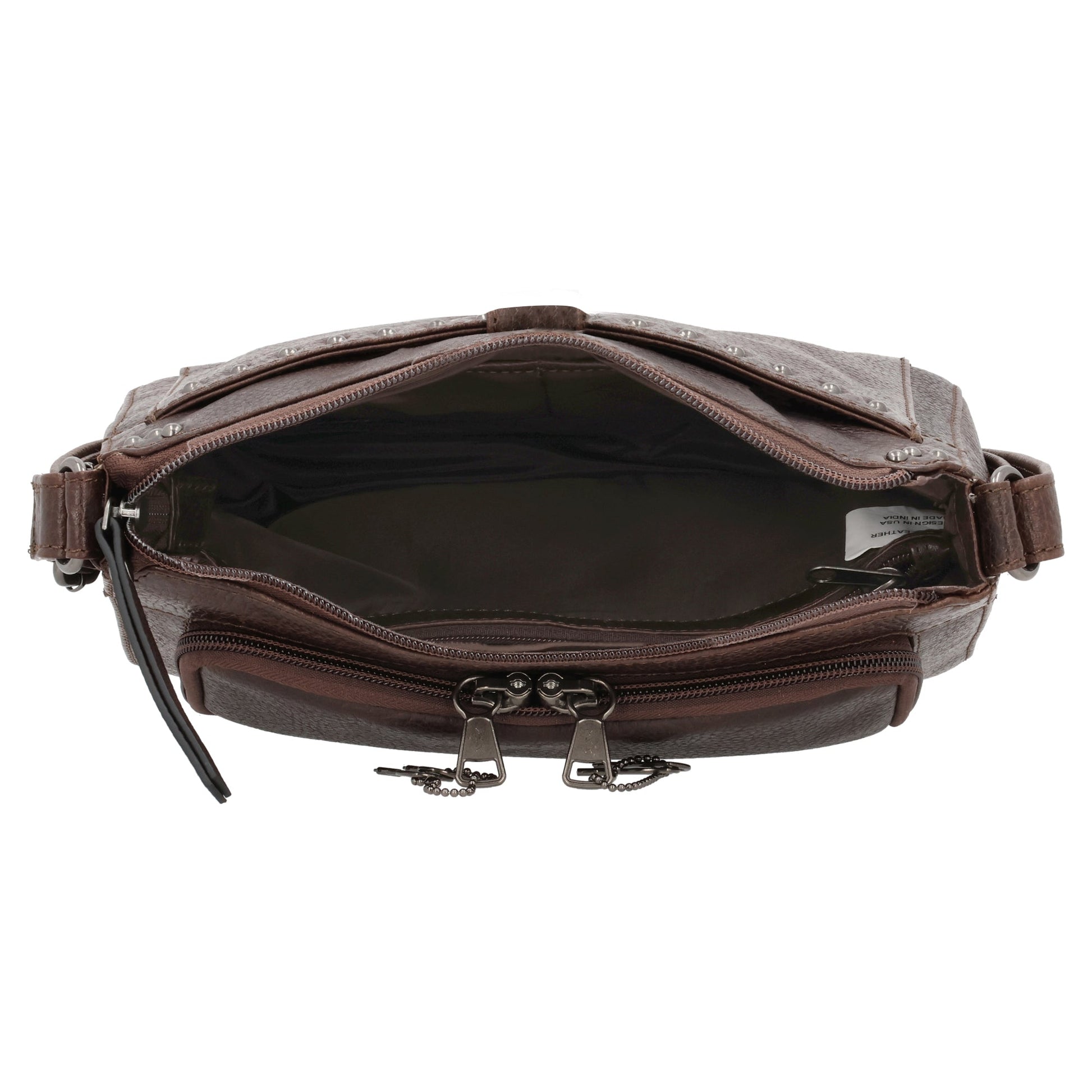 The Leah Buffalo Crossbody by Lady Conceal is crafted with firm, buffalo leather. The bag is highlighted with a light sprinkling of gunmetal studs. Inside the front pocket, secured with a snap closure, is a Lady Conceal exclusive slim wallet. The front pocket, secured with a snap closure, houses an exclusive Lady Conceal slim wallet. This RFID-protected wallet features 2 ID holders, 10 credit card slots, 2 open slit pockets for bills, and a full-size zippered pocket, ensuring your essentials are both organized and secure. The main interior is thoughtfully divided into two sections by a full-length zippered pocket. The front compartment offers two open slip pockets, while the back compartment includes a zippered pocket, a large open pocket, and a faux leather key strap for added convenience. The adjustable crossbody strap measures 29” to 54” in length and 1” in width, providing a comfortable drop of 13” to 26.5”. With its practical design and stylish details, the Leah Buffalo Crossbody is the perfect blend of functionality and fashion.