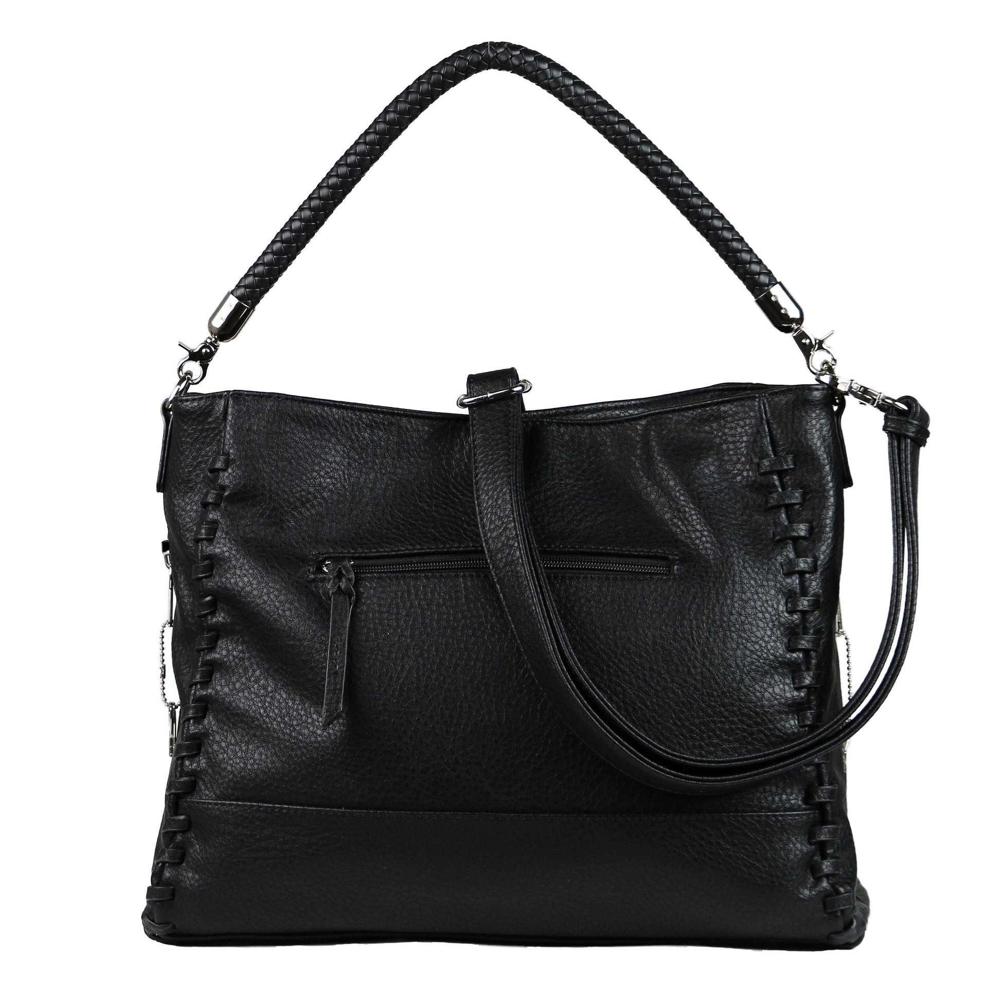 - Decorative front and back zippered pocket with braided tabs