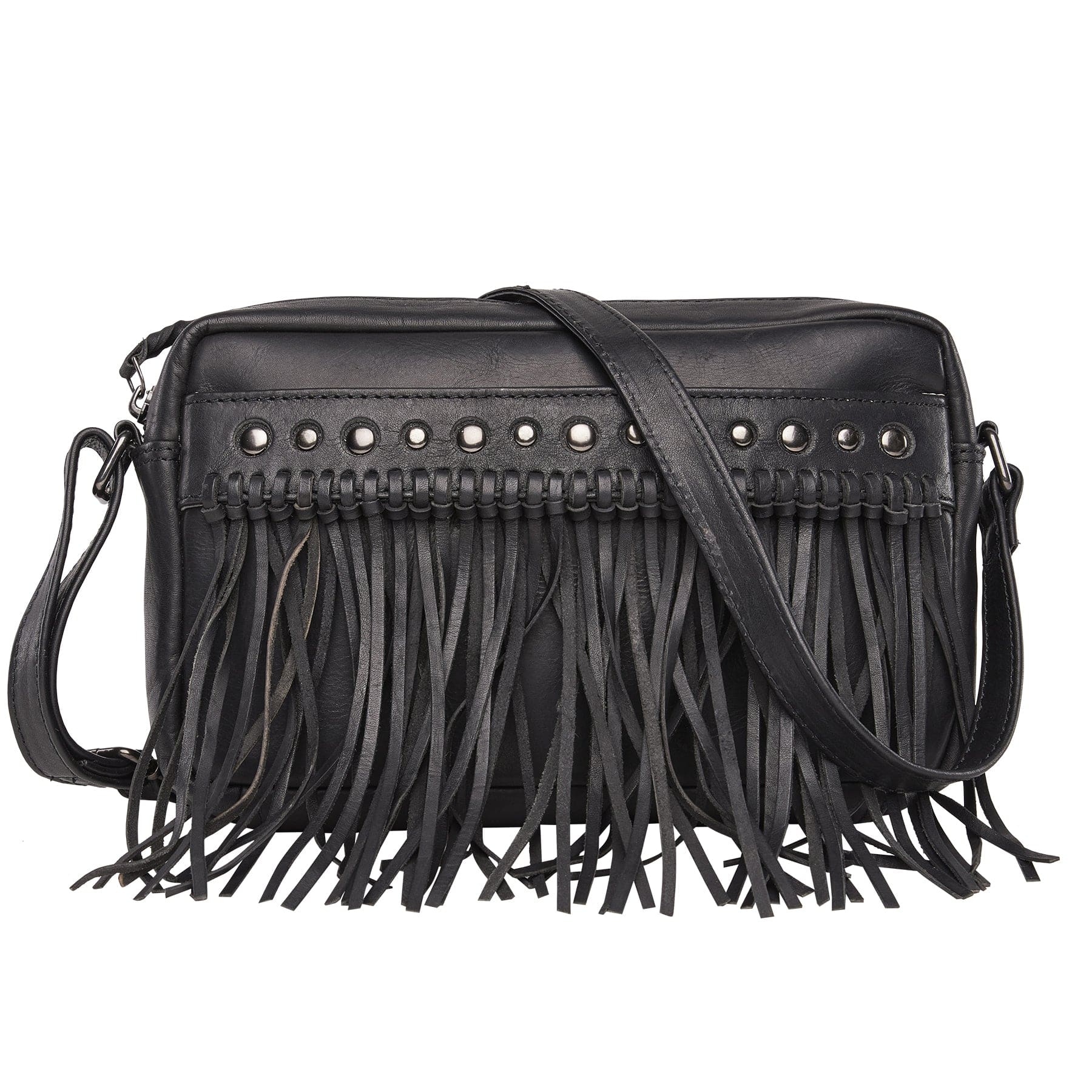 The Maggie fringe crossbody by Lady Conceal is crafted with full-grain leather. The fringe and inlaid metal studs add attitude to your step. The full-size front open pocket secured with a magnetic clasp is perfect for your cell phone. The main interior features a zippered pocket, a large open slip pocket, and a leather key strap. The adjustable crossbody strap measures 29”-55” (drop 12”- 25”) by .75" W.