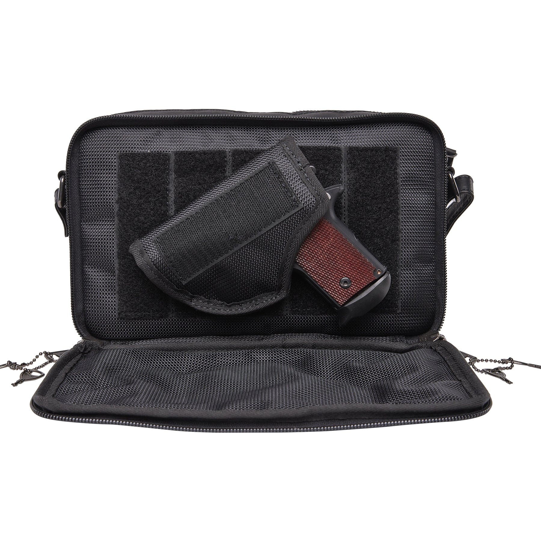 The concealed carry compartment is designed for right or left-handed use, zips open on 3 sides, and measures approximately 9.5" W x 5.5" H. It is secured with YKK locking zippers and includes 4 keys. This pocket is constructed of scratch-resistant nylon and can accommodate up to a medium-frame handgun. A universal holster is included which features Velcro on both sides for a secure fit in the concealment pocket.