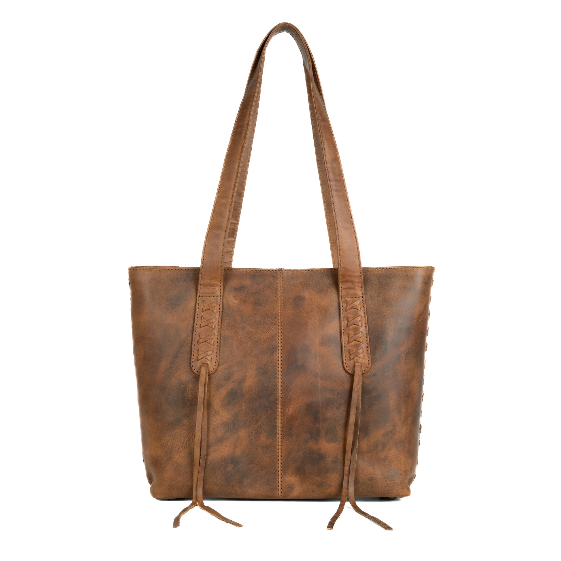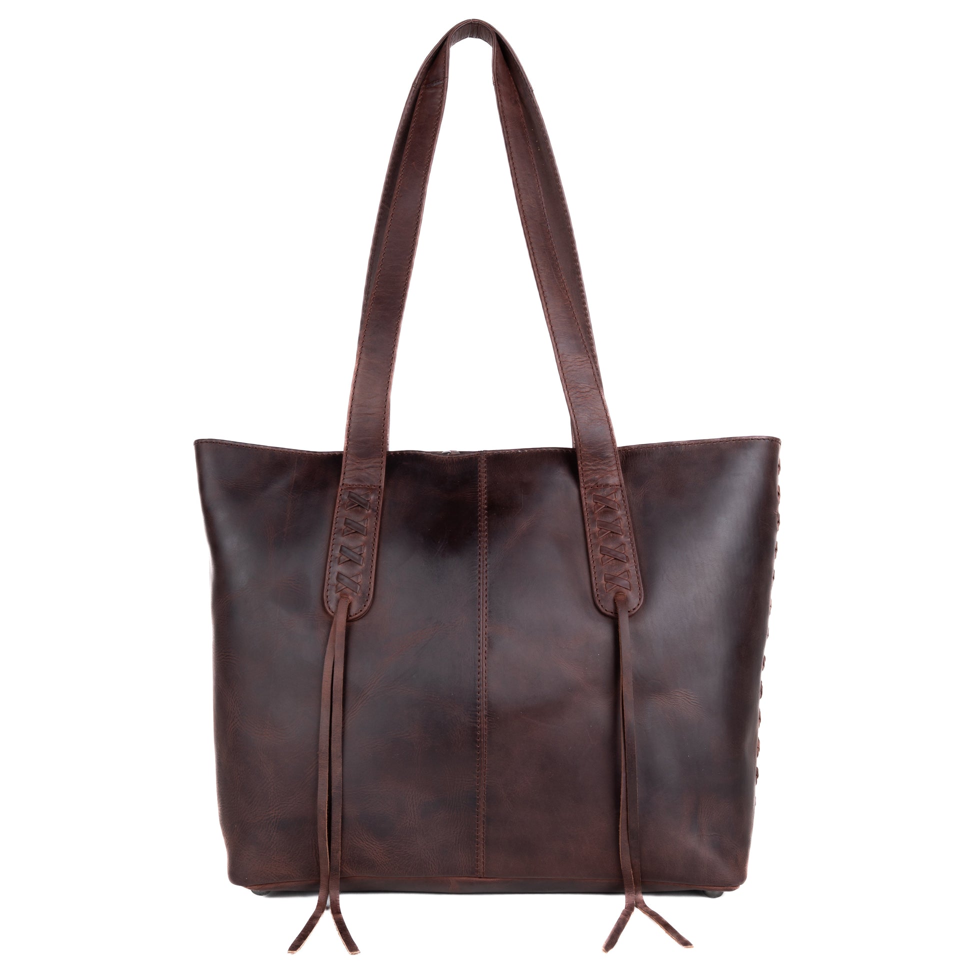 The Norah Leather Laced Tote by Lady Conceal is made of premium full-grain leather, boasting unique natural variations in grain and shading. This tote is a larger version of the Reagan Tote. It showcases intricate leather crisscross stitching on both front and back, adorned with long tassels on the front and matching stitching on both ends. It features a full-length zippered pocket that divides the interior into two compartments. The front is crafted with two deep open slip pockets, the back has a zippered pocket, a large open pocket for your cell phone, and a key strap. The double handles measure 26” long with a 12.5” drop.