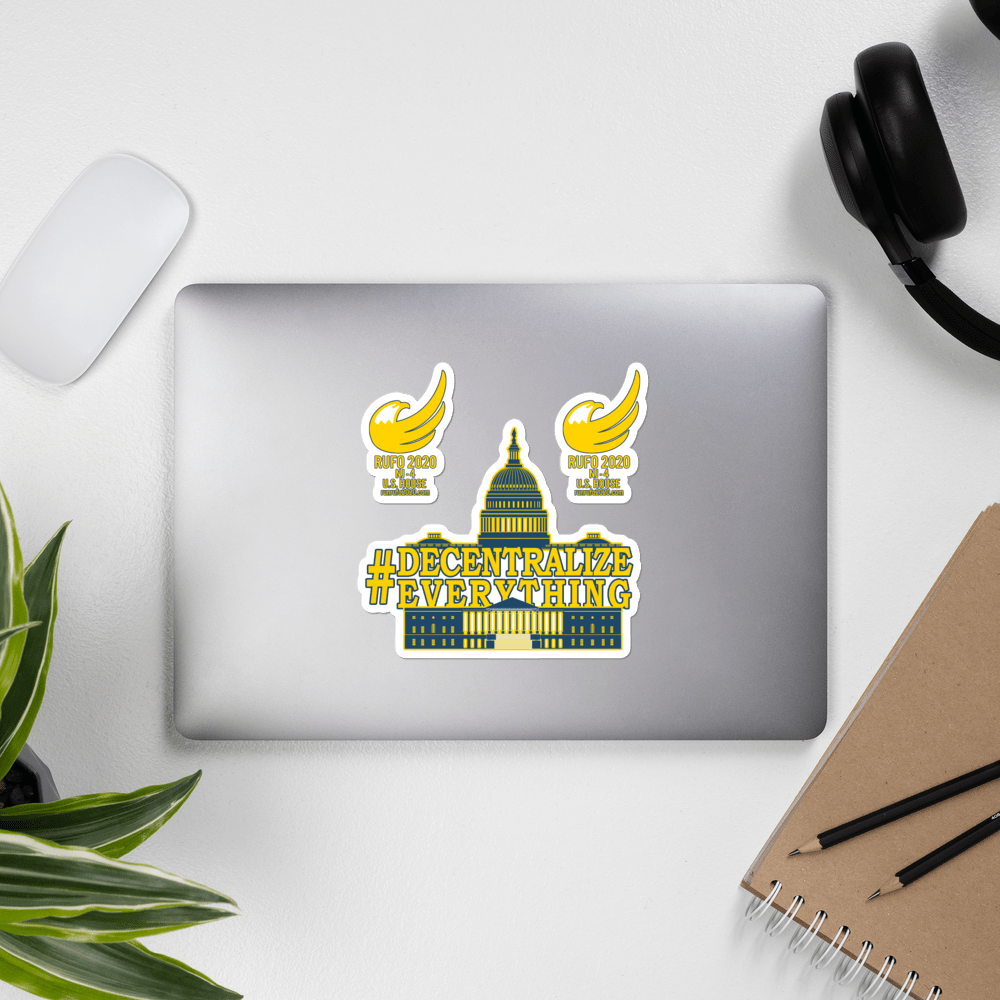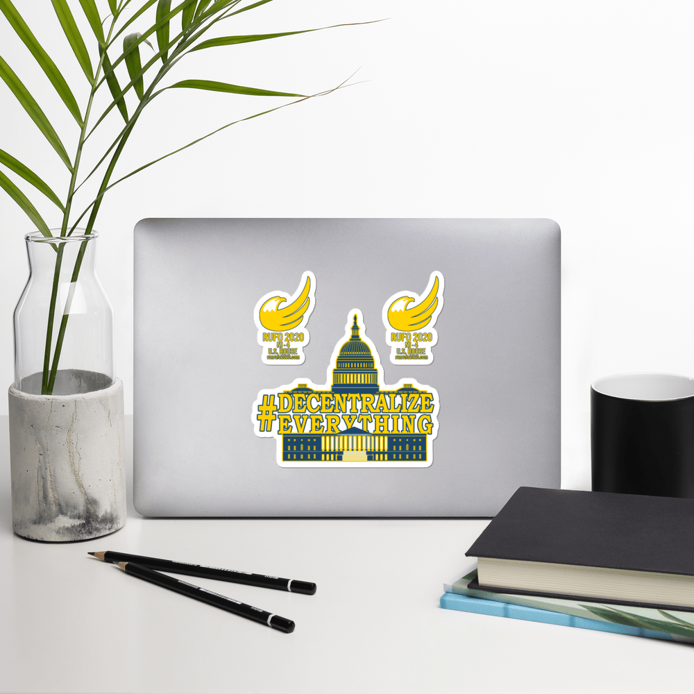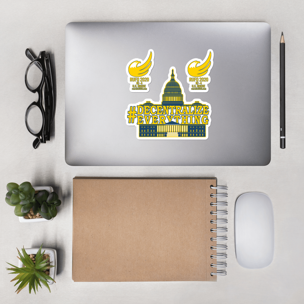 "Go against the grain with #Decentralize Everything stickers! Show your support for Michael Rufo's congressional campaign in a fun and quirky way. Spread the message of decentralization with these bubble-free stickers. (Non-toxic and microwave safe!)"