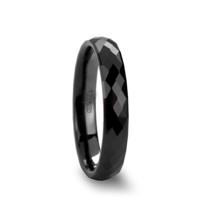 This stylish Back Ceramic wedding band by Thorsten has 288 diamond shaped facets hand-machined onto its surface and has an exquisite black onyx-like color. Can be worn as a wedding band or promise ring by men or women.