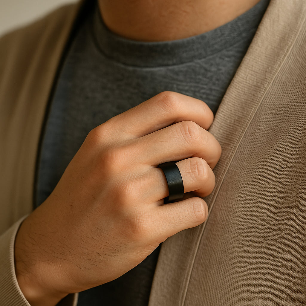 This simple style flat black 10mm black tungsten ring is bold and masculine. This generously wide band has a beautiful black coating that is brush finished, meaning it is not shiny.