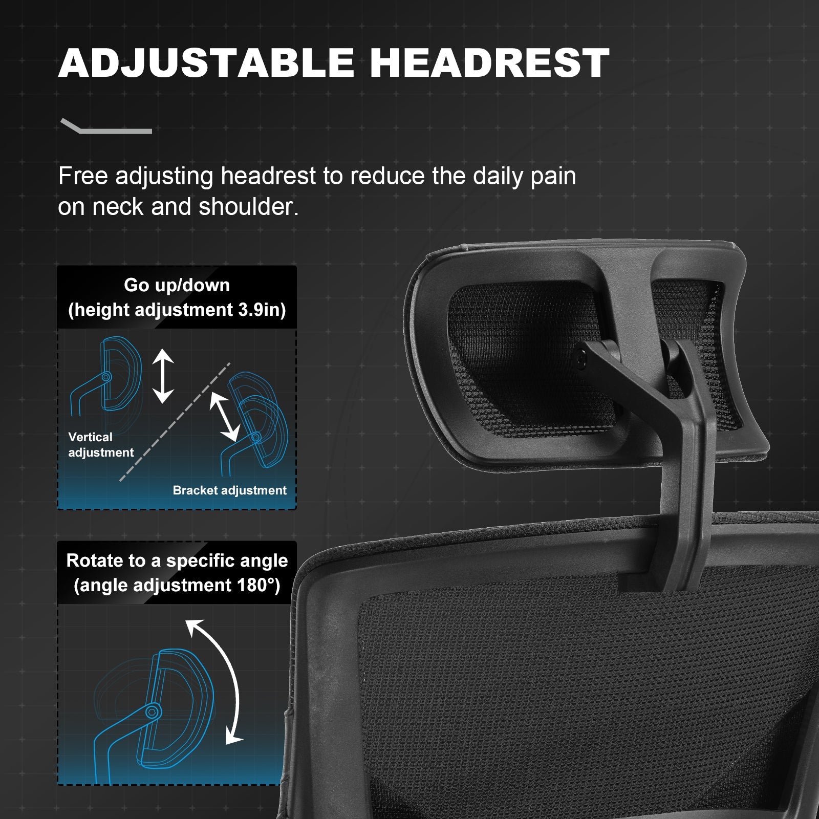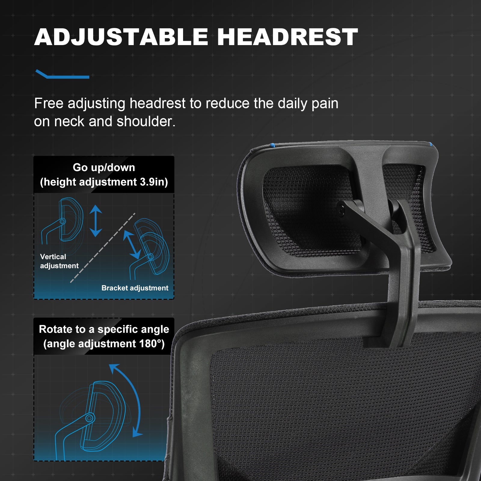 - ADJUSTABLE FEATURES: This office computer chair designs with adjustable lumbar support / headrest support. Free rotating headrest protects the cervical vertebra. Full backrest system fit lumbar spine, Which makes it a perfect gaming partner.