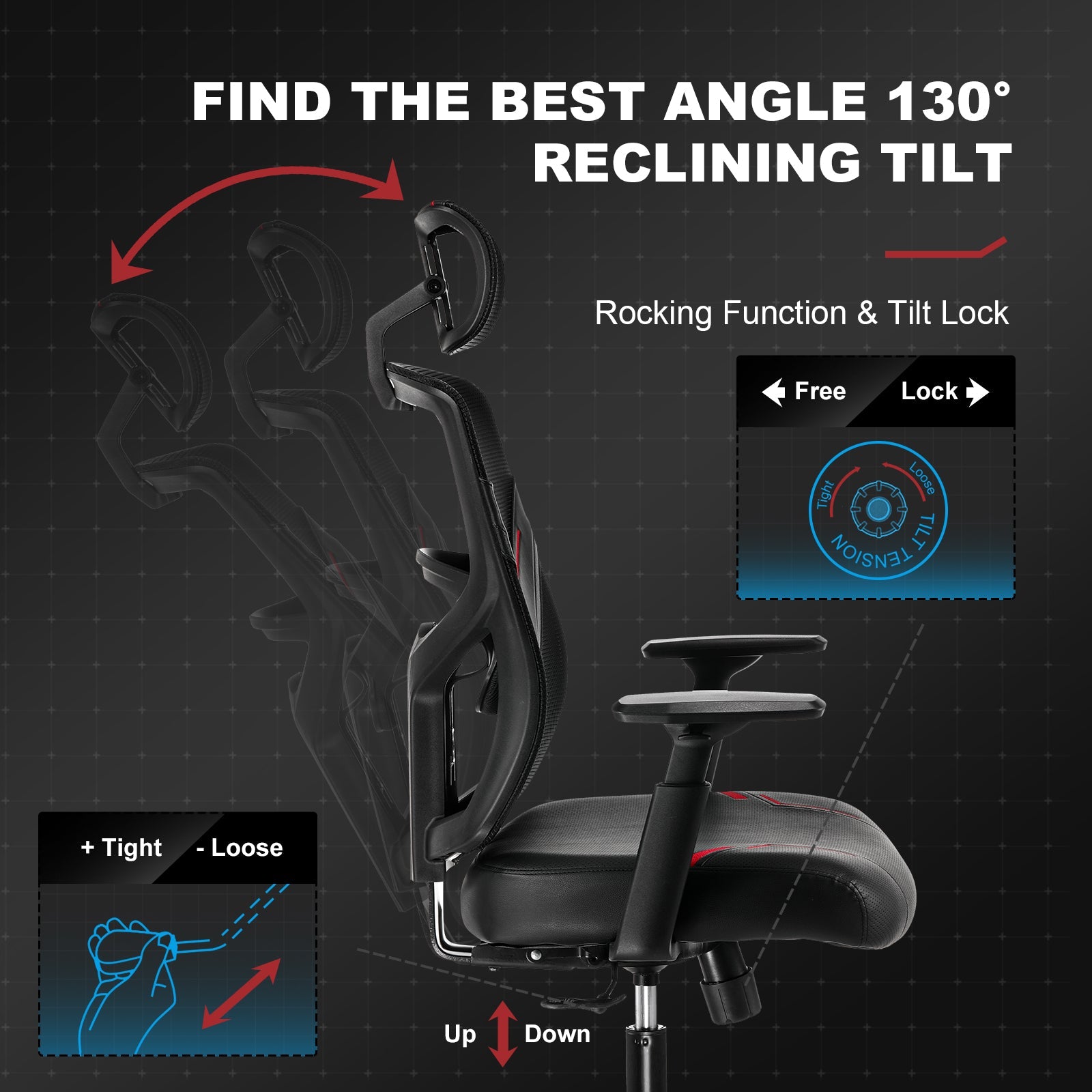 - RELAXING TILT FUNCTION: Would you like to enjoy a moment of relax between long hours of work? Our ergonomic chair with reclining and lockable backrest allows up to 130° of tilt to keep you in the comfort zone for your next task or simply to lounge back. You may lock/unlock the tilting of the back by simply pushing the lever inwards/outwards from under the seat cushions.