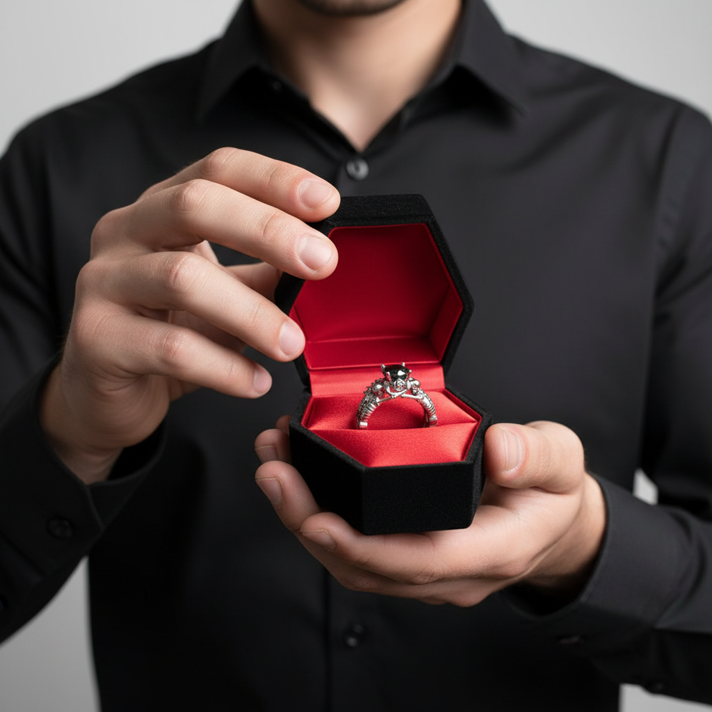 A stunning 1.5 carat black moissanite diamond set in a 14k gold skull band. This handcrafted gothic ring symbolizes eternal love with dark romance and timeless elegance—ideal for those who embrace bold, unconventional style.