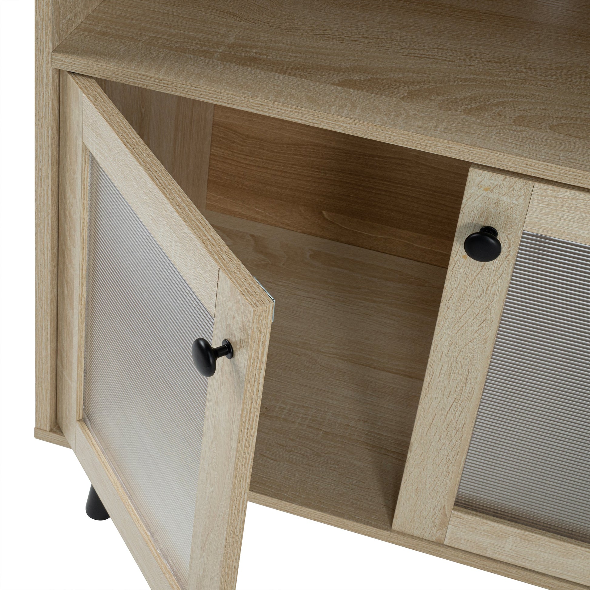 【Mid-Century Style】 :Elevate your living room with this natural-colored TV stand, featuring a mid-century modern design with tapered legs and fluted door panels—perfect for enhancing your multiple spaces.
