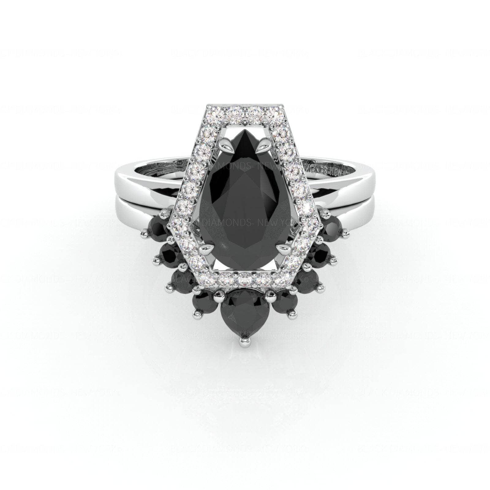 Faithfulness-1ct Black Pear Cut Diamond 14k White Gold Coffin Ring Set