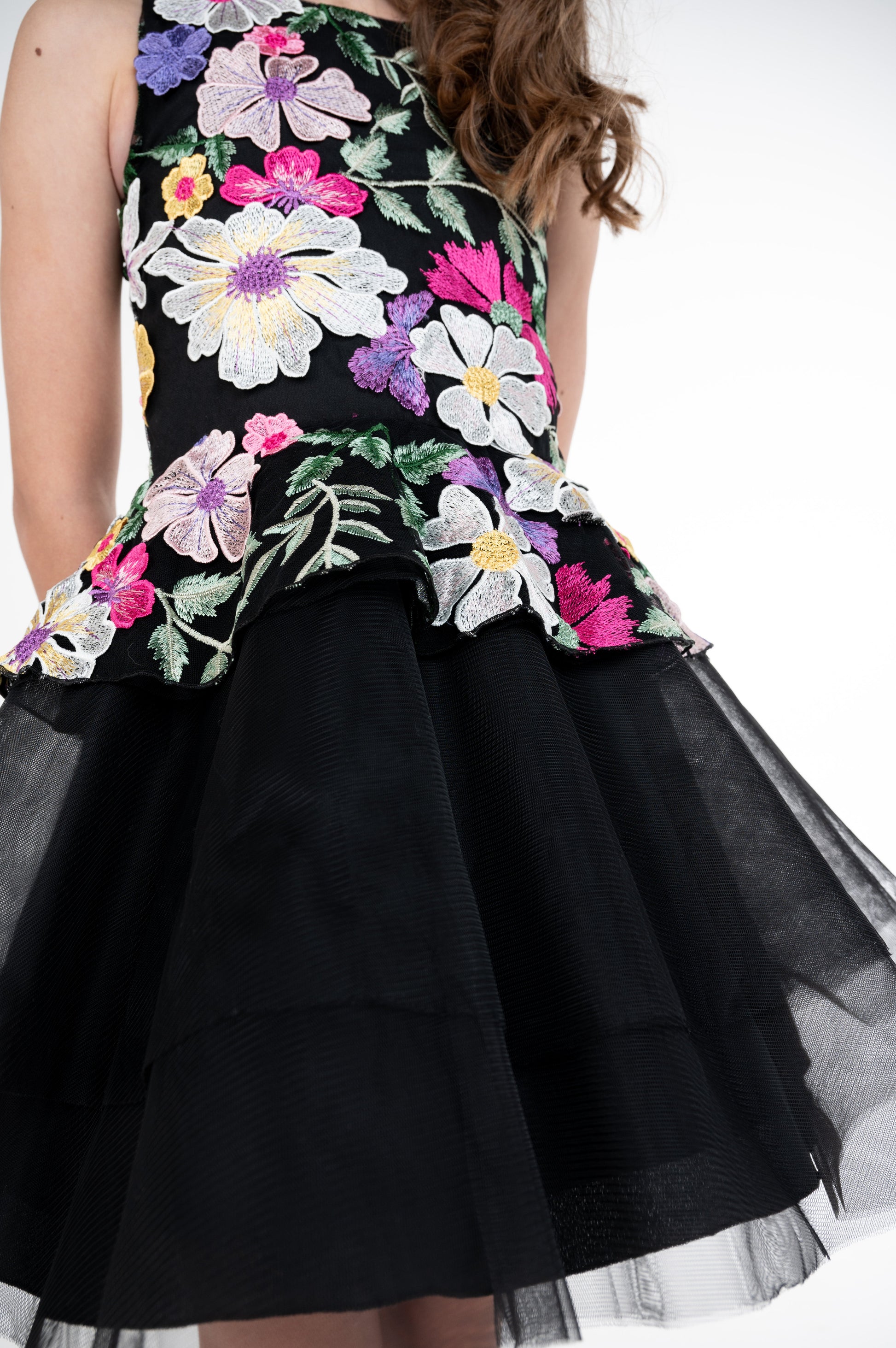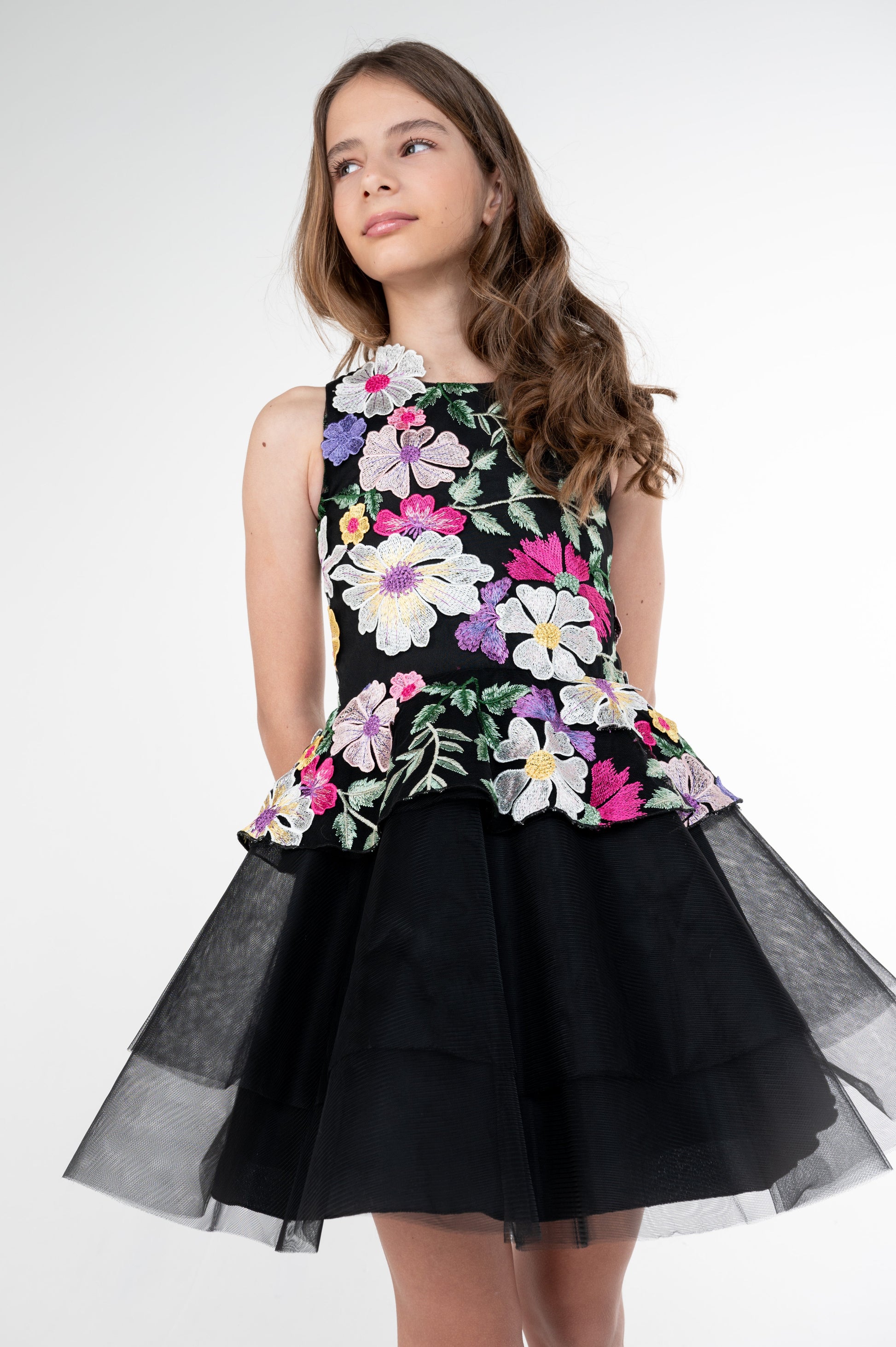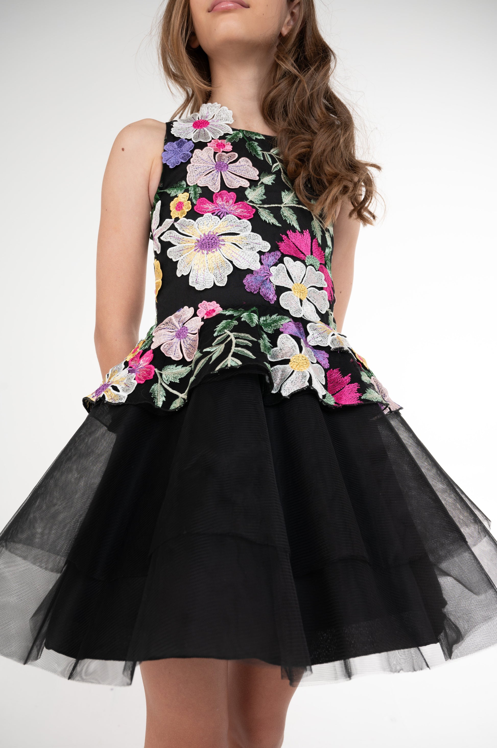 - Zoe "Fiona" peplum dress with a multicolor 3D floral applique bodice