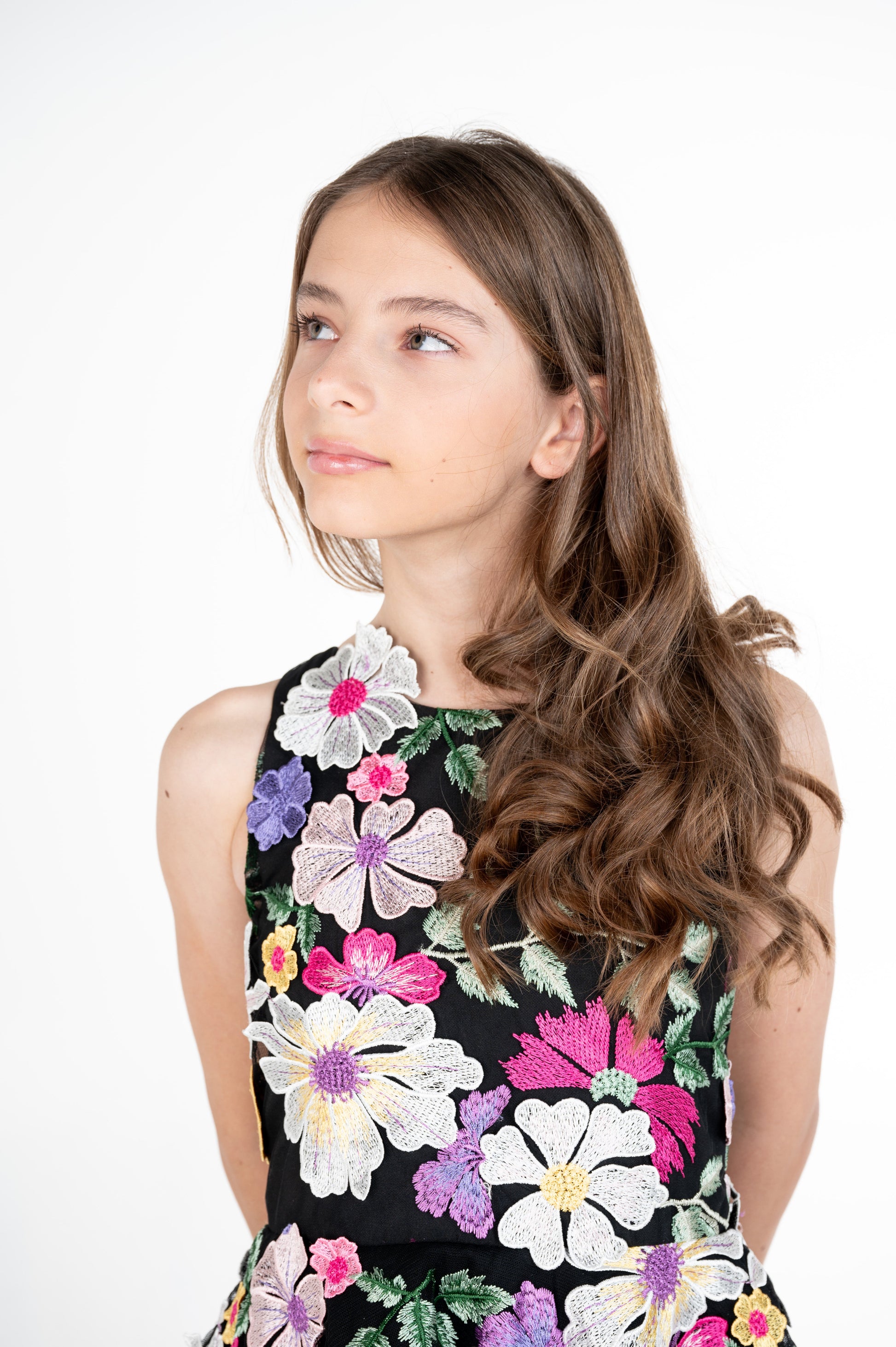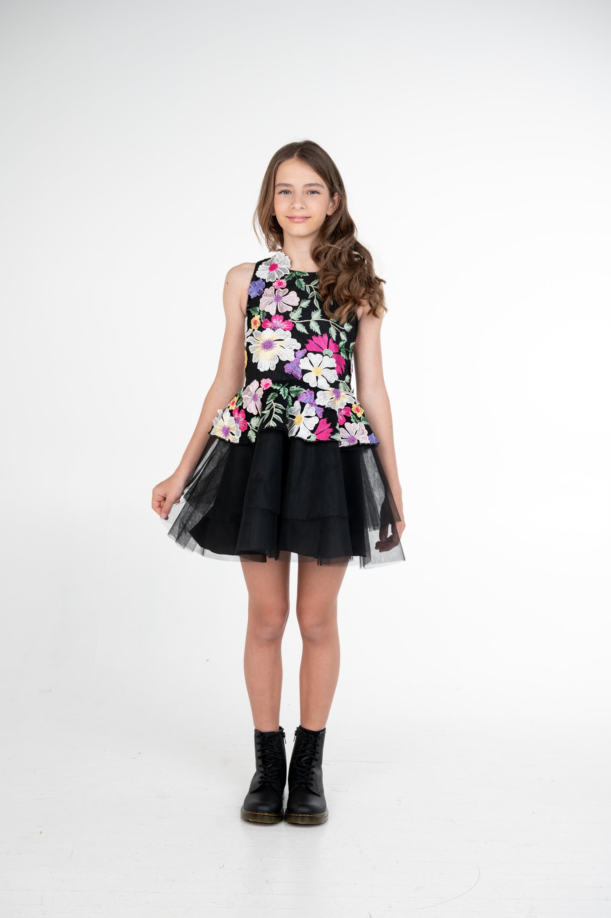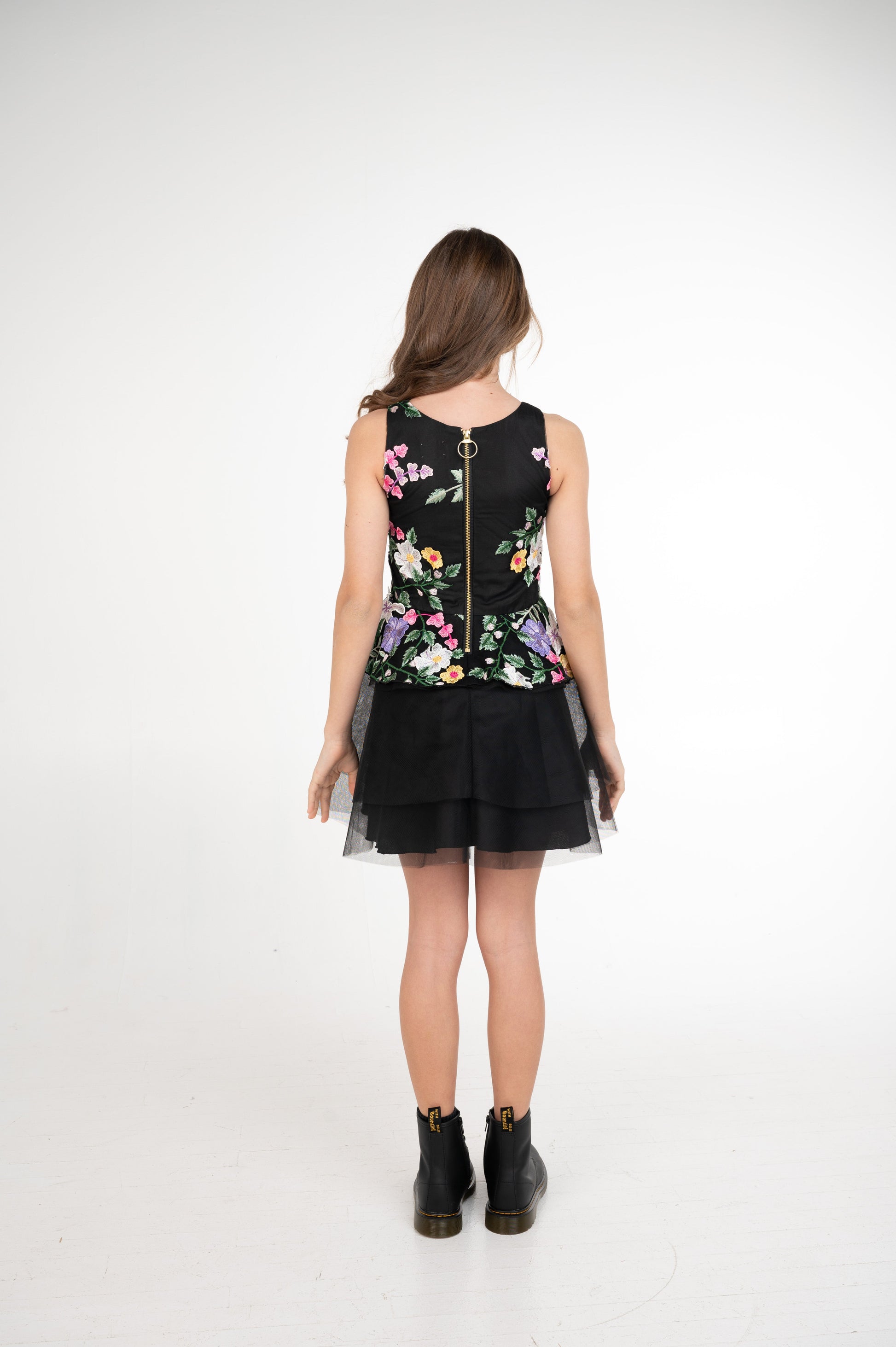 - Zoe "Fiona" peplum dress with a multicolor 3D floral applique bodice