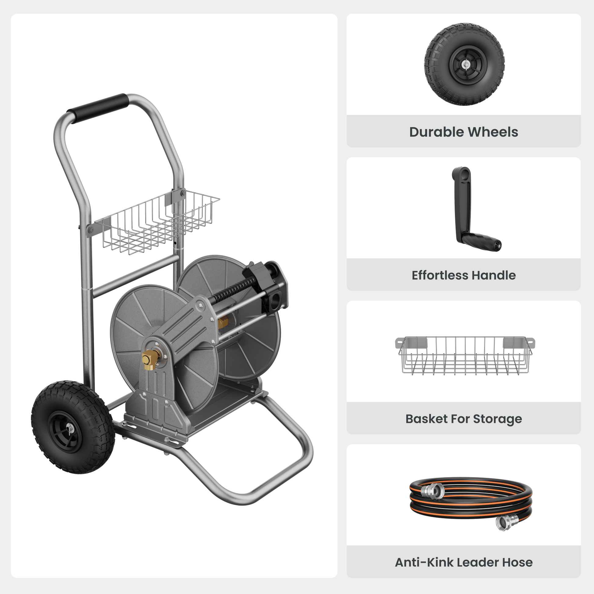 The hose reel cart has a heavy-duty steel construction and a unique hose guide, it is suitable for use in a variety of environments. The garden hose cart has an individual guide system and high-quality materials, holding up to 150 feet of a 5/8 inch hose.