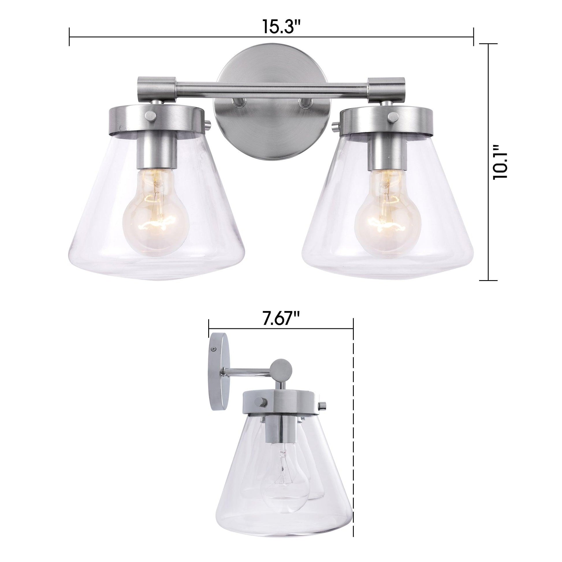 The Gleam Modern Farmhouse 2-Light anity Light is a stylish addition to any home. Made from high-quality steel, this vanity light is both durable and long-lasting. The clear glass shades provide a beautiful, unobstructed view of the bulbs inside.