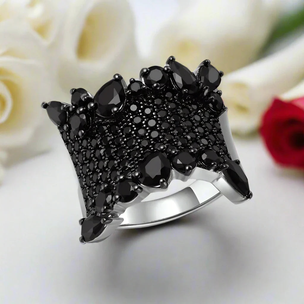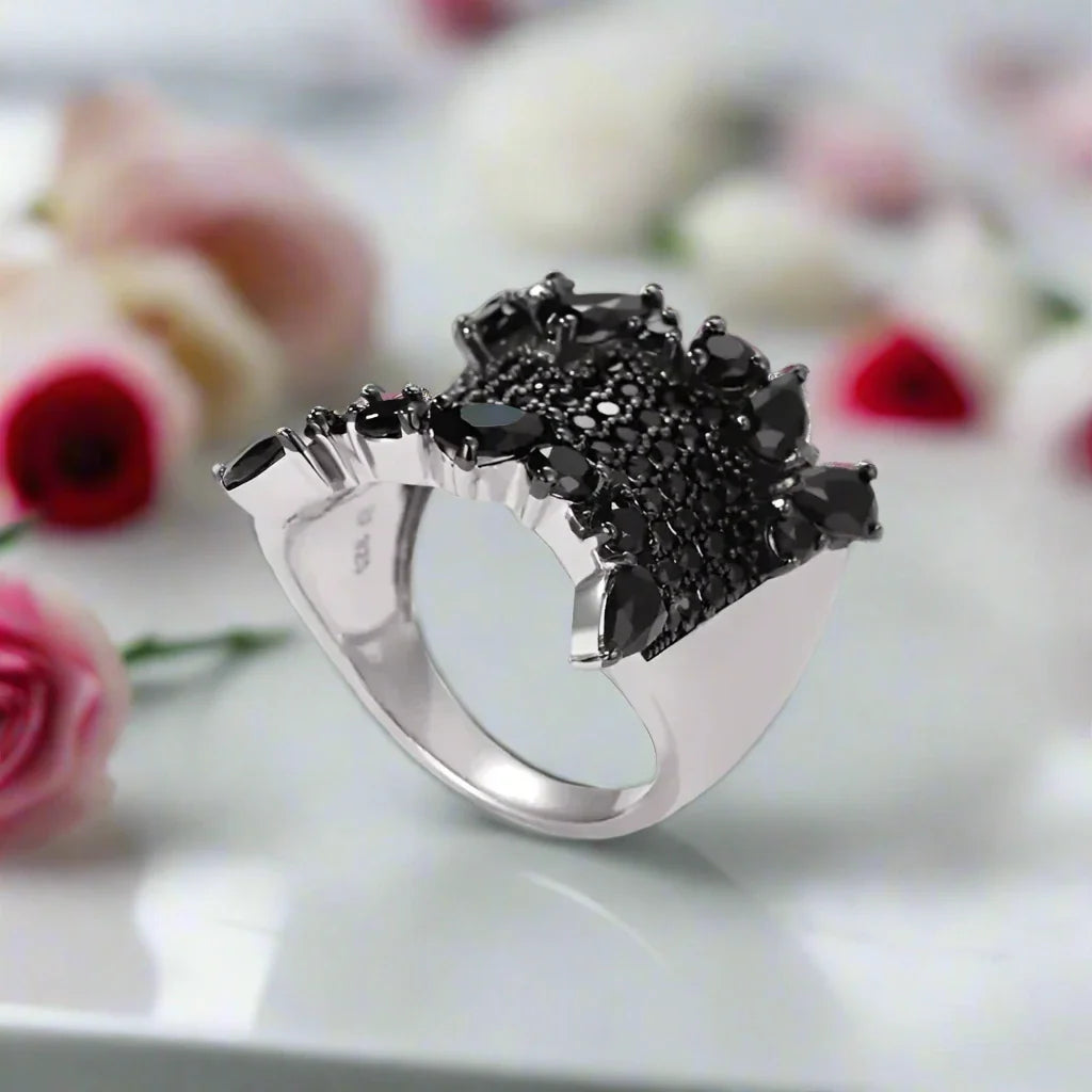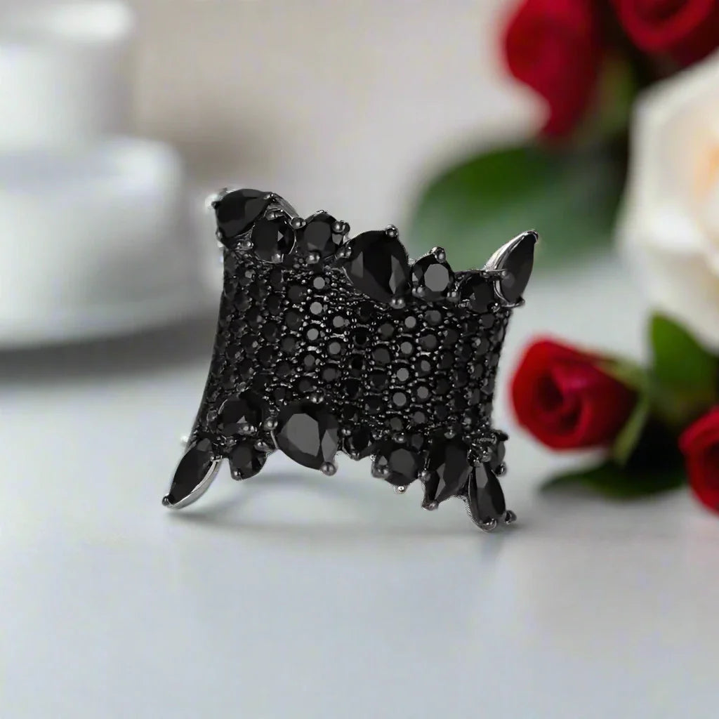 This stunning ring features a 925 sterling silver band and a beautiful pear-shaped Black Spinel gemstone. The deep black color of the stone adds a chic and elegant touch to the 925 stamped metal. This cocktail ring is the perfect statement piece for any occasion.