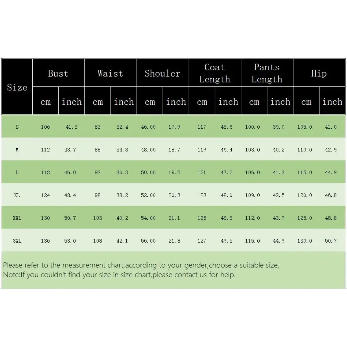 Size | Coat Length (cm/inch) | Pants Length (cm/inch) |
