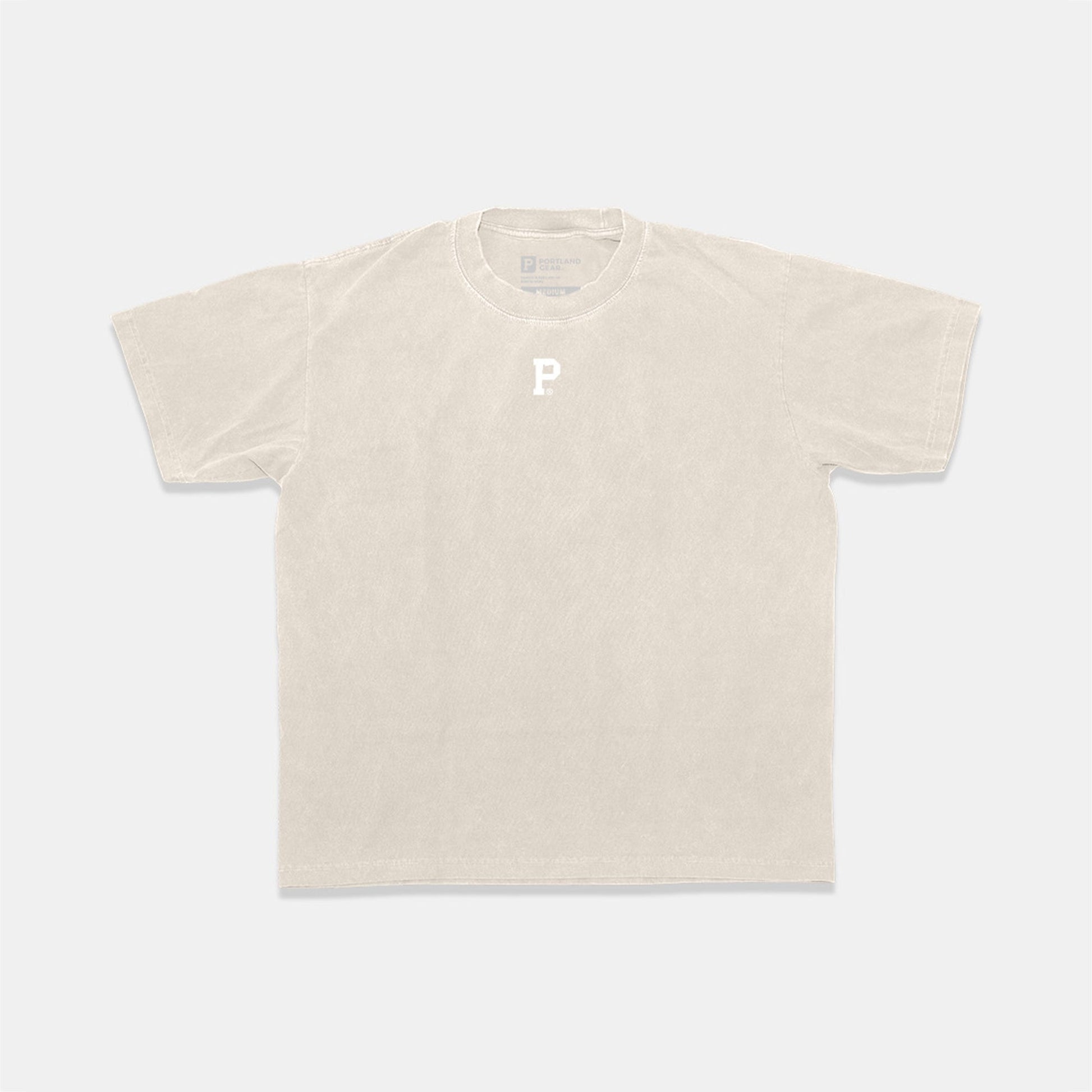 Simplicity at its finest. Inspired by simple logos front and center, and products that are meant to be layered. Printed on an oatmeal/tope colored tee with a high density white "P" logo print.