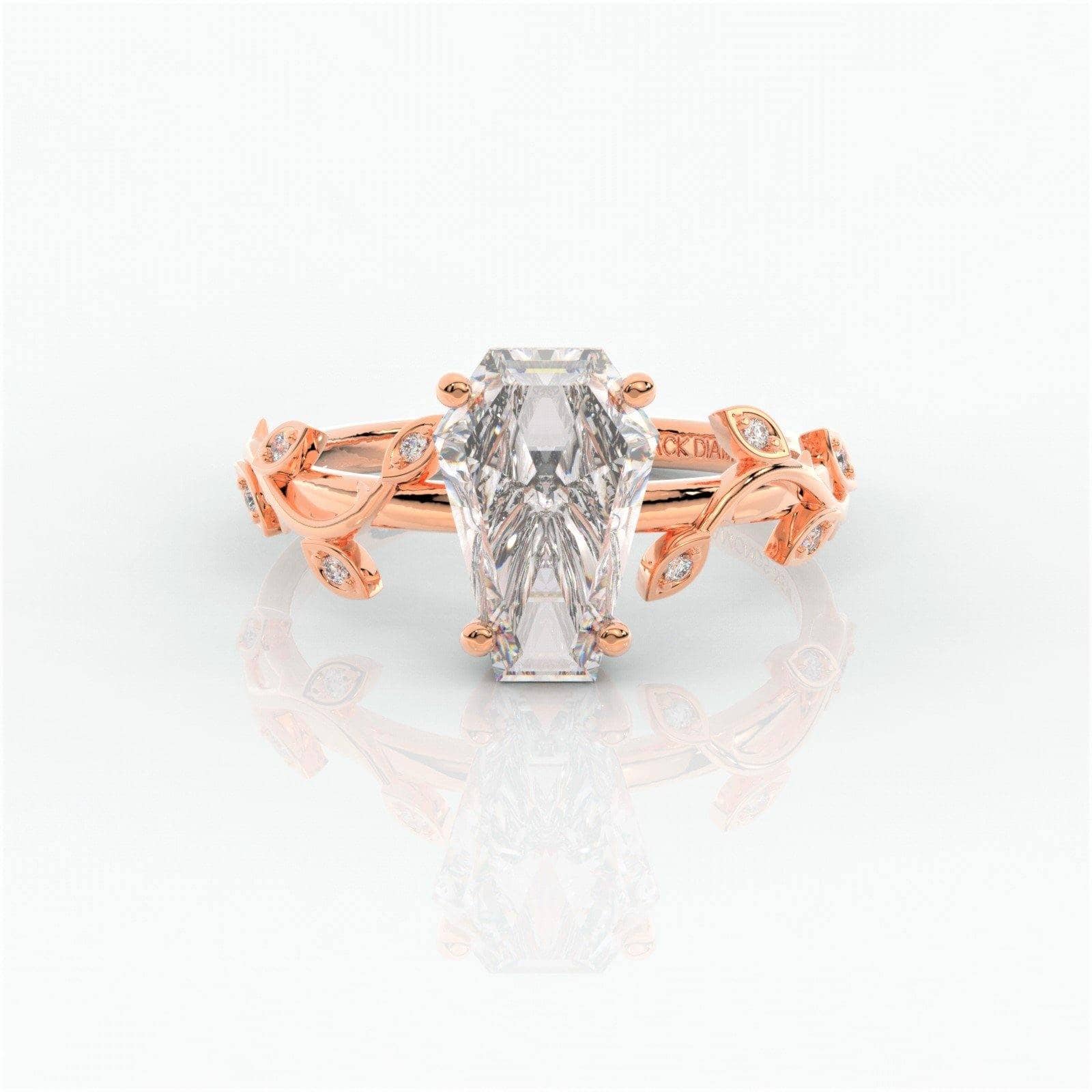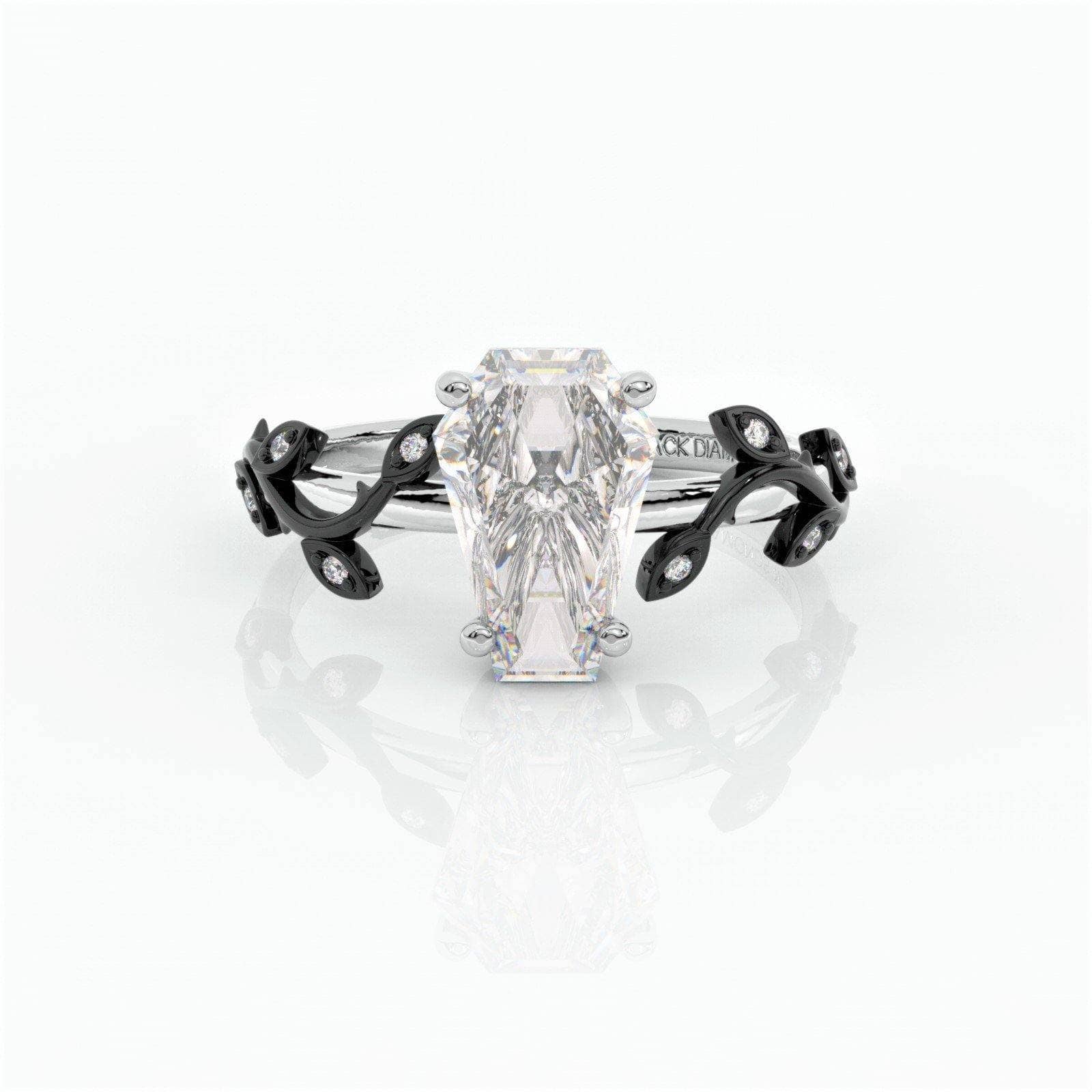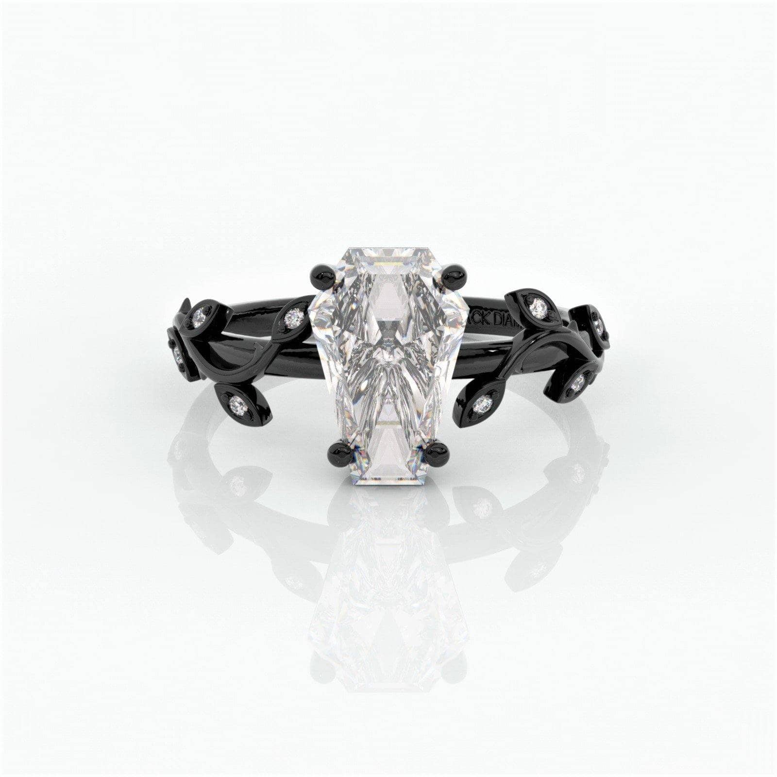Their love wasn't a fairy tale; it was a pact sealed in fire and shadow. Our "Hell and Back" ring, a testament to a love that endured every trial, tells their story. Crafted from the warm glow of 14K rose gold, the ring's intricate design features a twisted vine of black gold, each leaf studded with a glimmering diamond—a symbol of the beauty that blossomed from their shared struggles. At its heart lies a striking coffin-cut moissanite, a stone as resilient and unique as their unbreakable bond. This ring is a promise of a love that has been to hell and back, emerging stronger and more beautiful than ever.