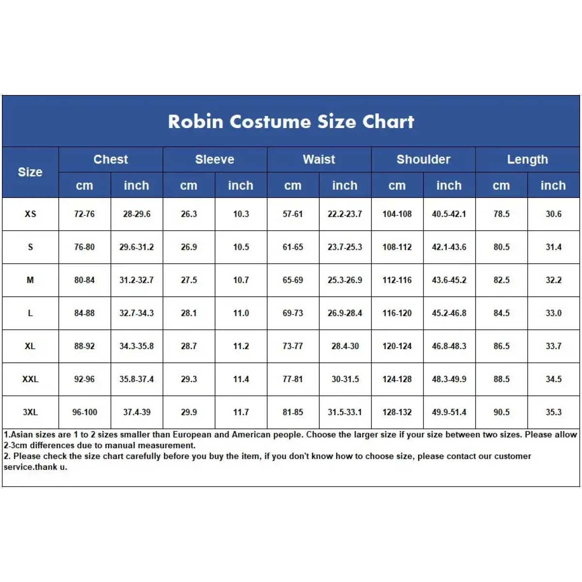 Size | Waist (cm/inch) | Sleeve Length (cm/inch) | Length (cm/inch) |