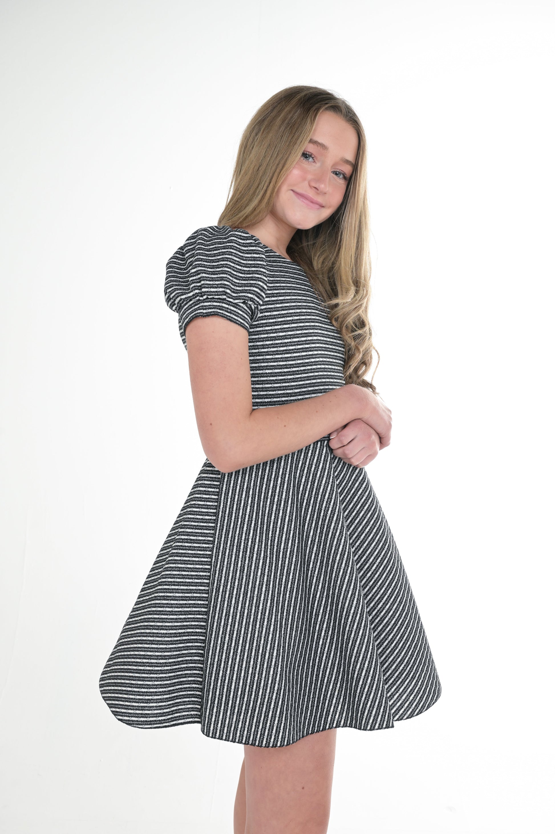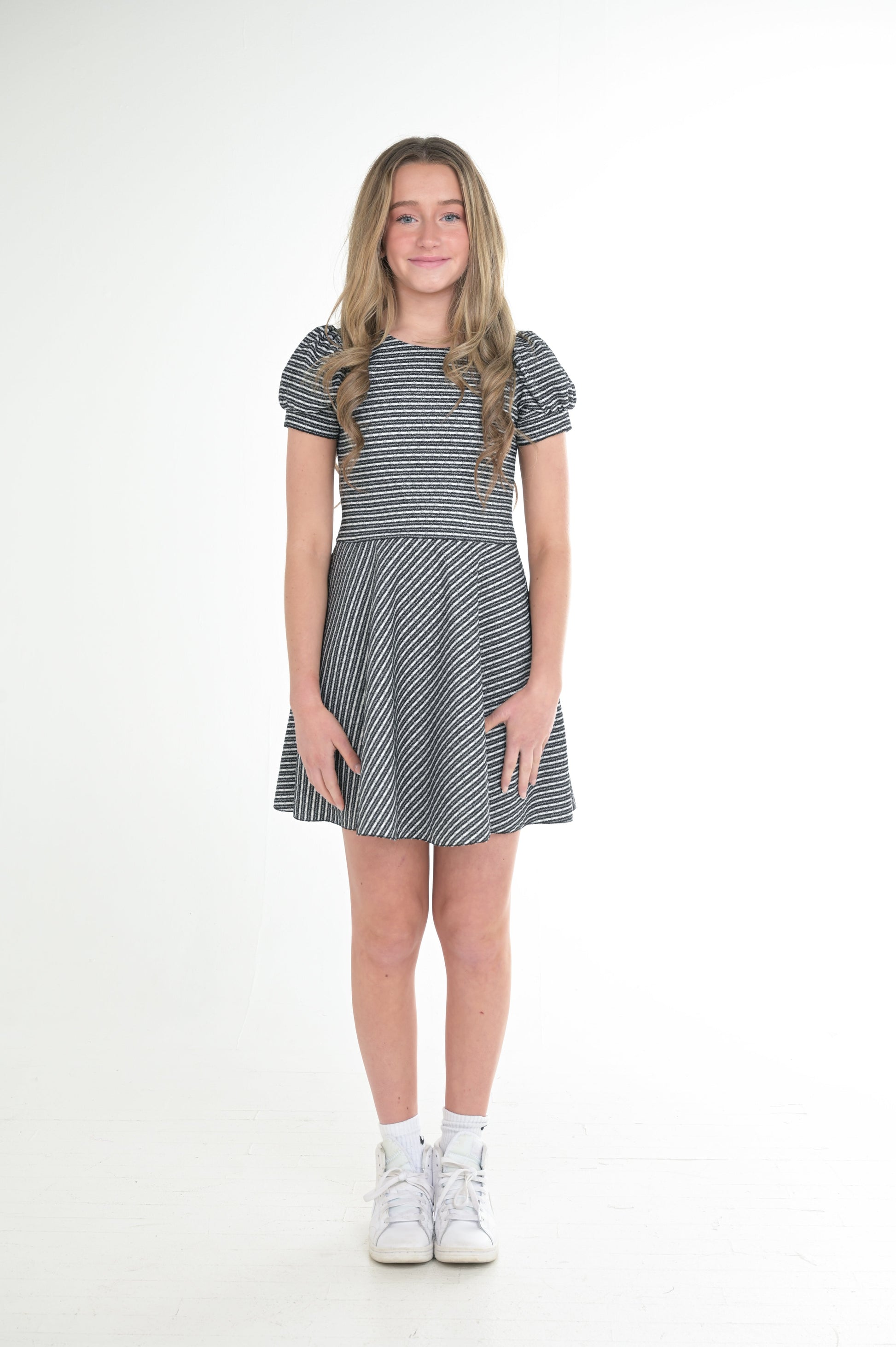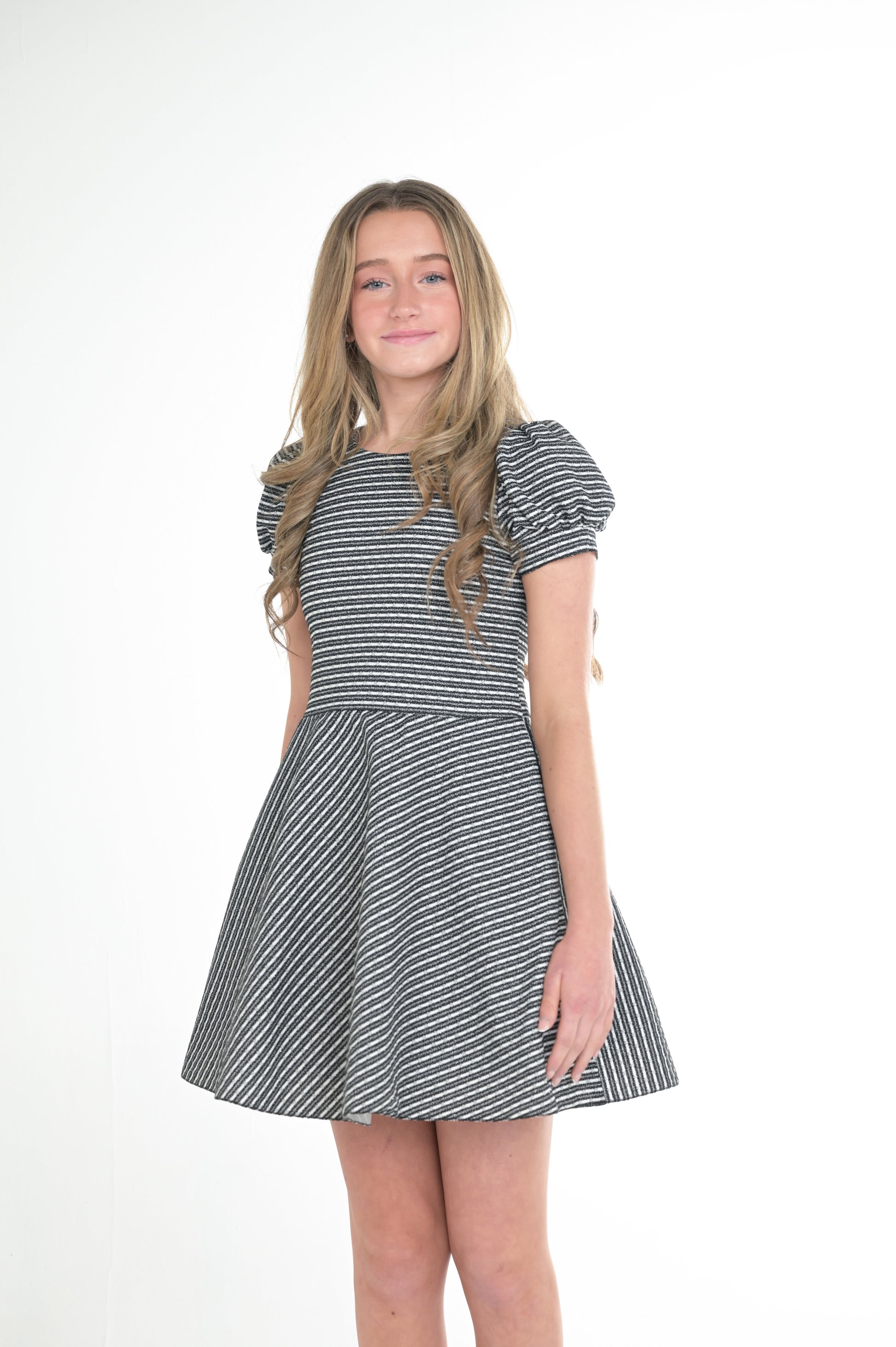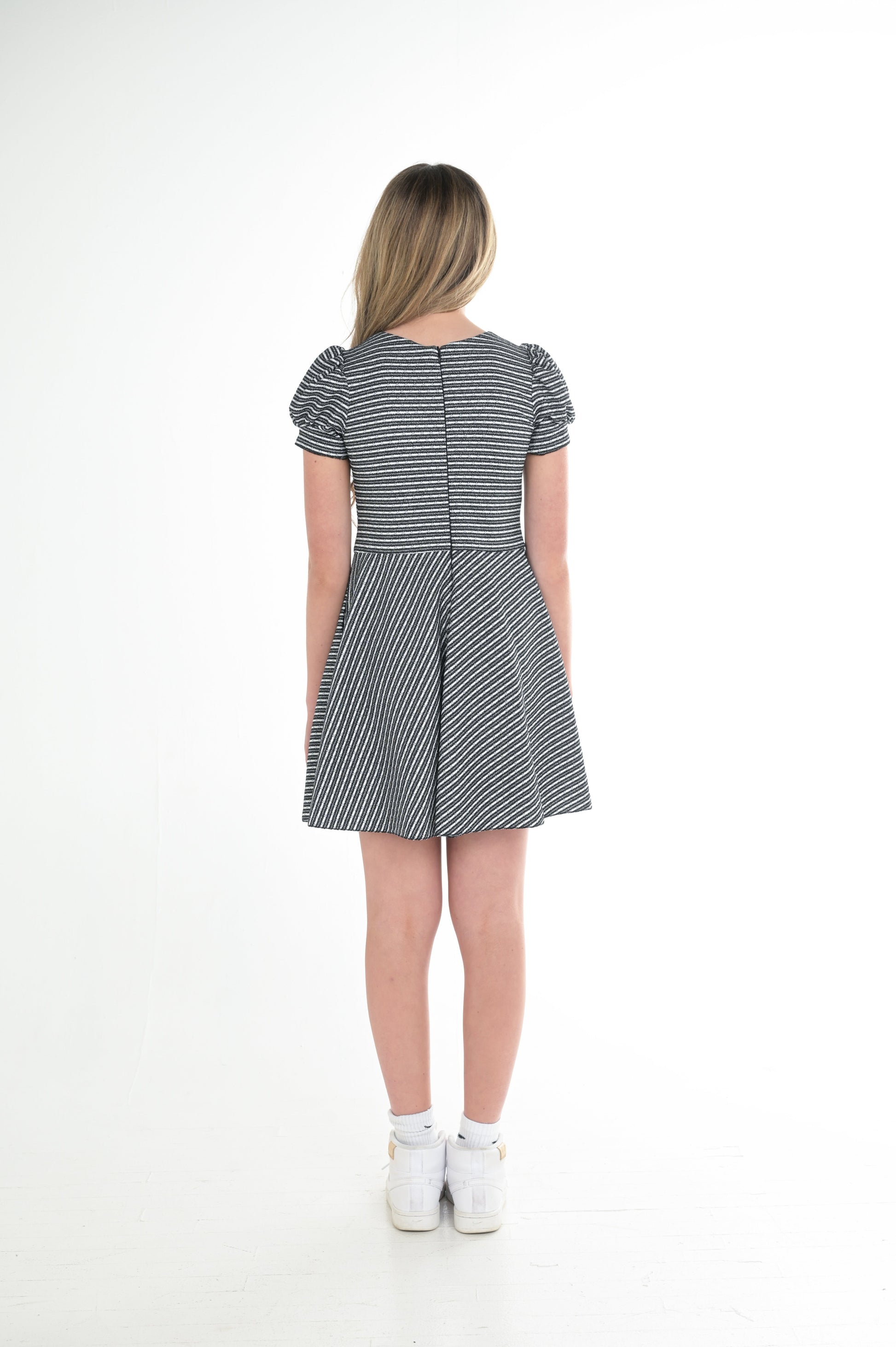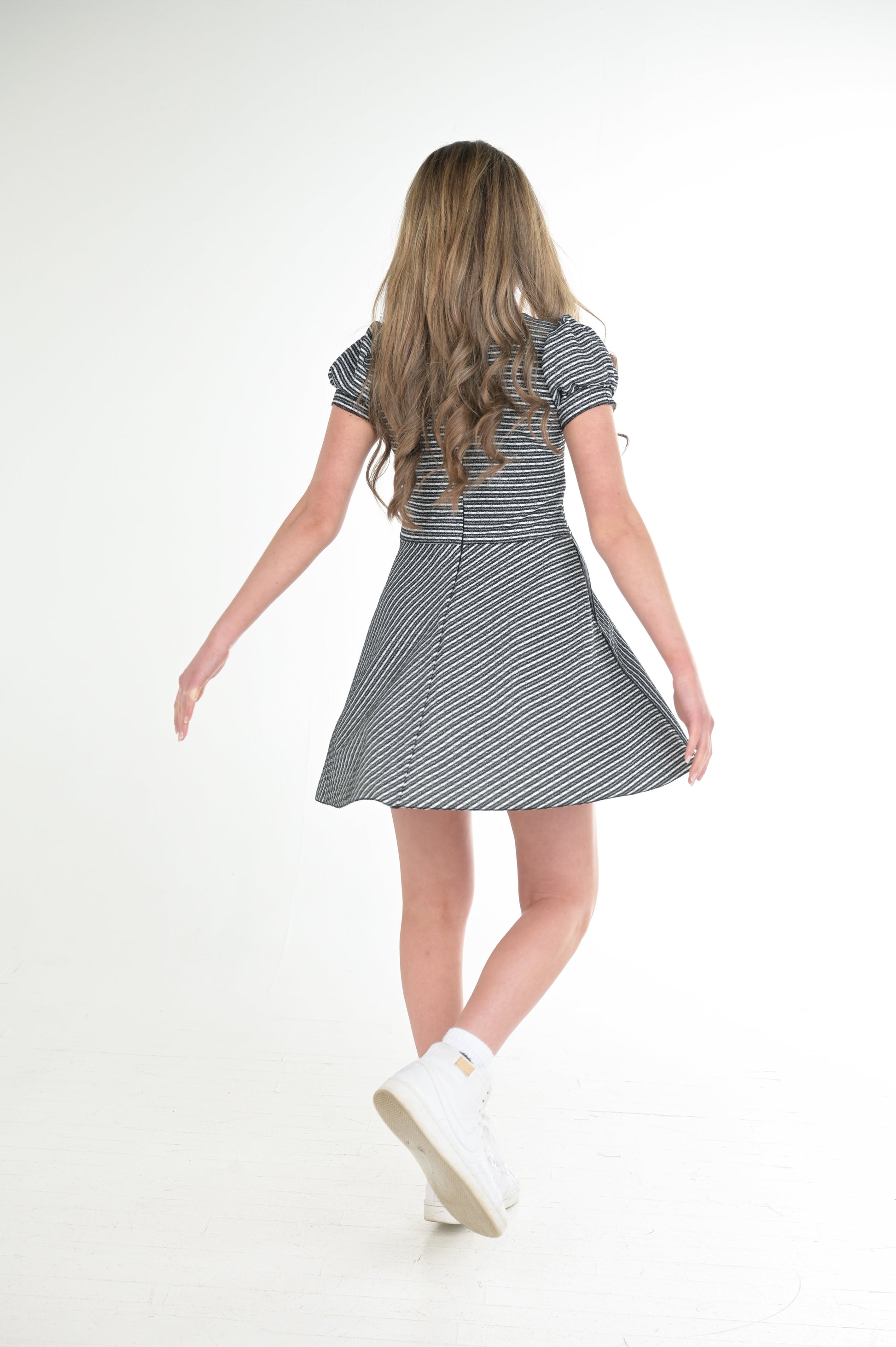 - Zoe "Hudson" mini dress in black and white stripe