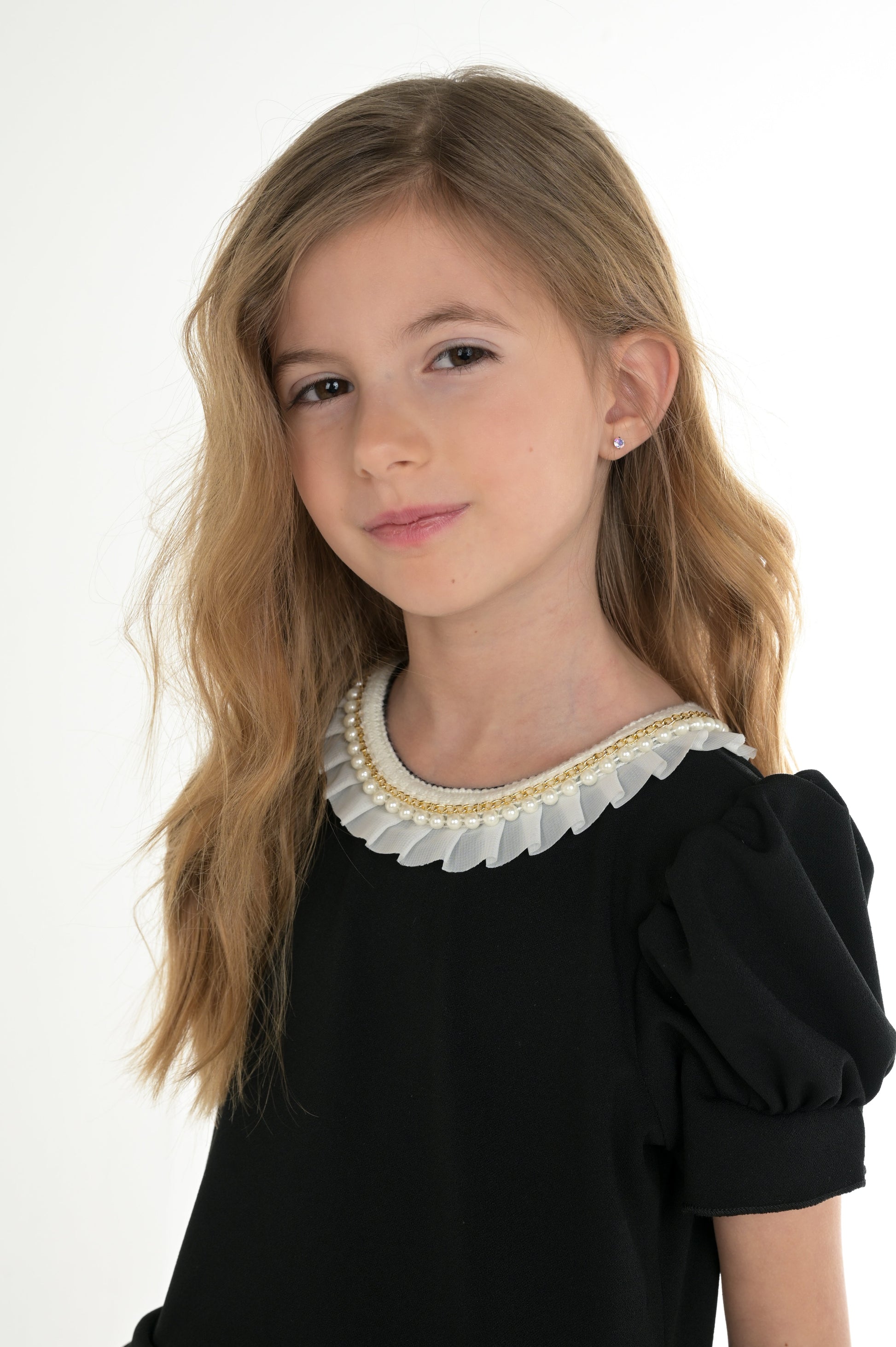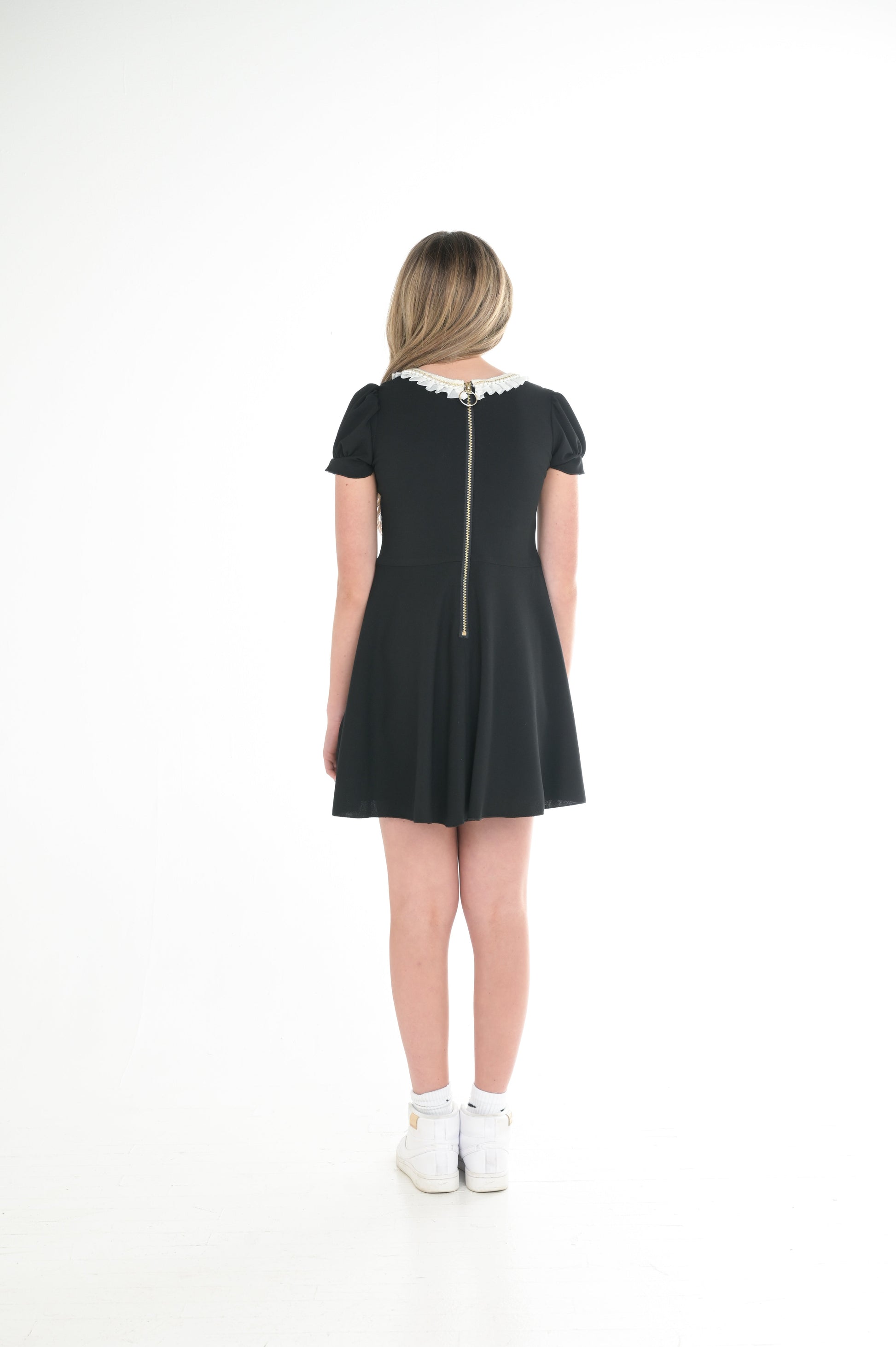 - Zoe "Hudson" mini dress with pleated collar and pear detailing