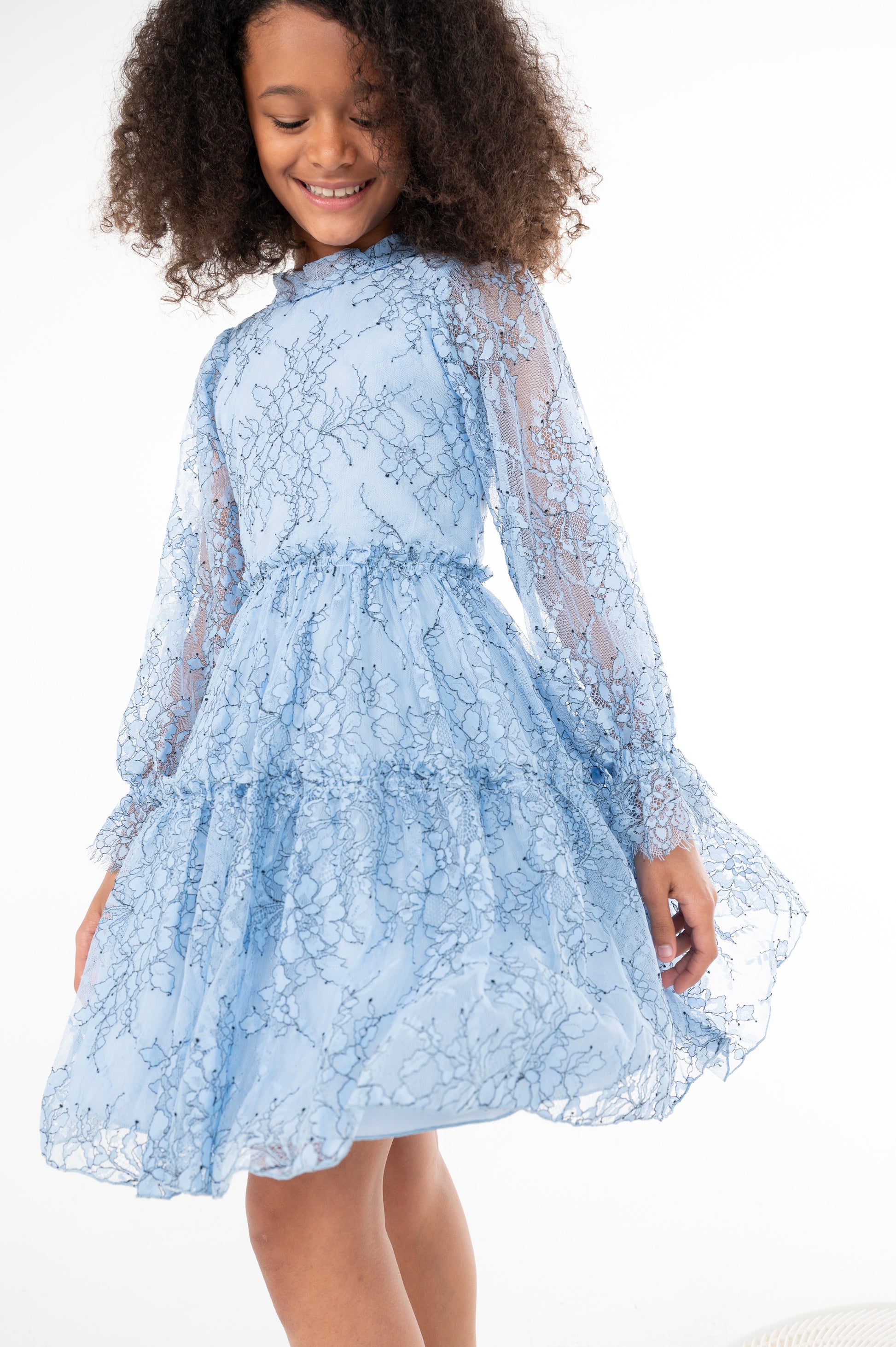 - Zoe "Jordana" lace tiered dress adorned with floral accents