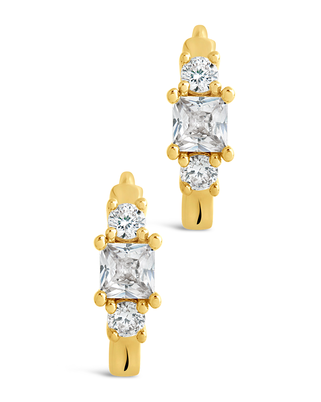 A bold sparkle in a compact silhouette—meet the Kendall CZ Hoops. Featuring a striking trio of brilliant-cut stones, these mini hoops bring sculptural shine to any look. Stack them with studs or wear solo for max impact in minimal space.