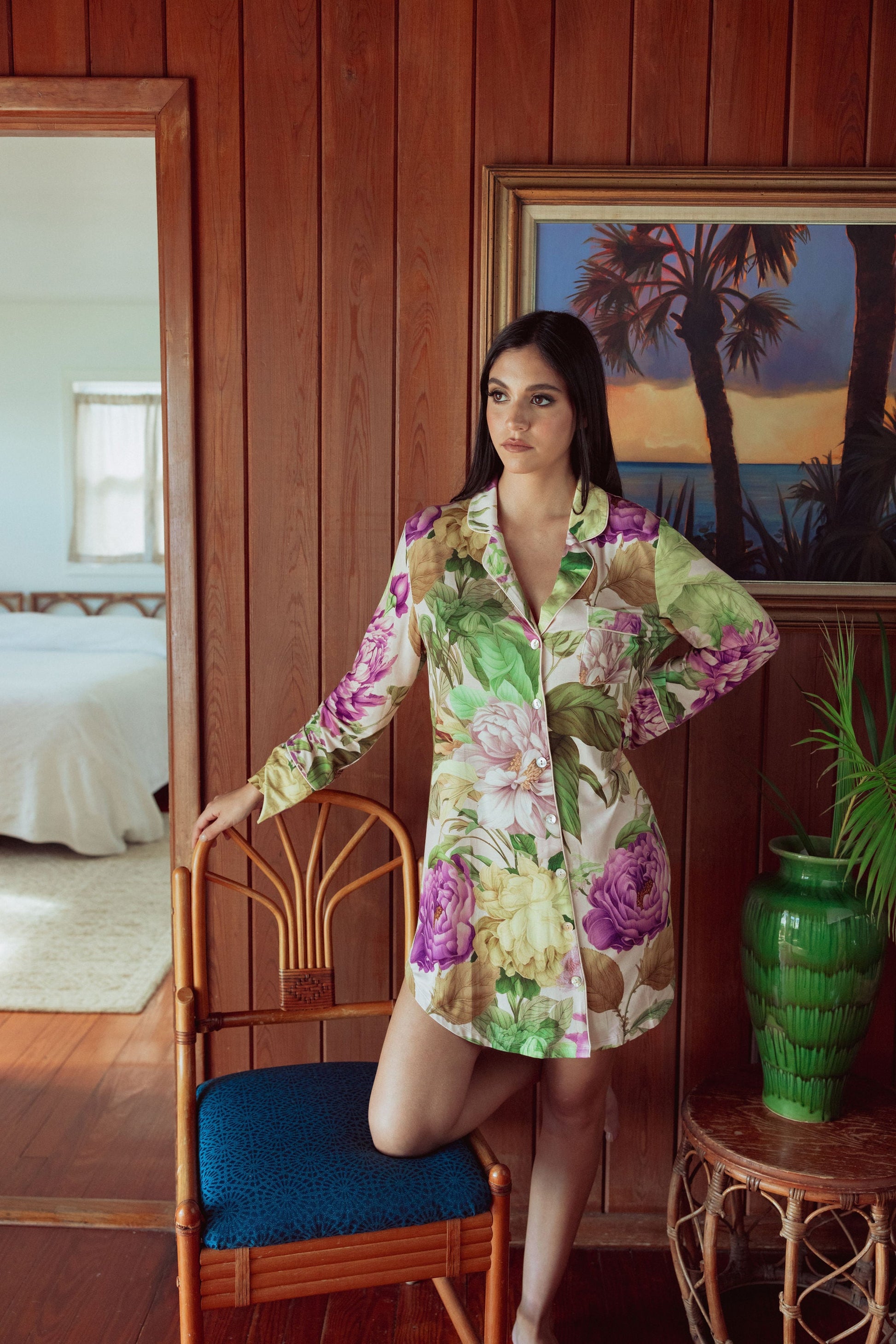 Long sleeve Sleepshirt with curved hem. Mother of pearl buttons at front closure and pocket at chest. Satin piping. Made with the softest Lenzing Modal jersey digitally printed with our vibrant Spring Garden print.