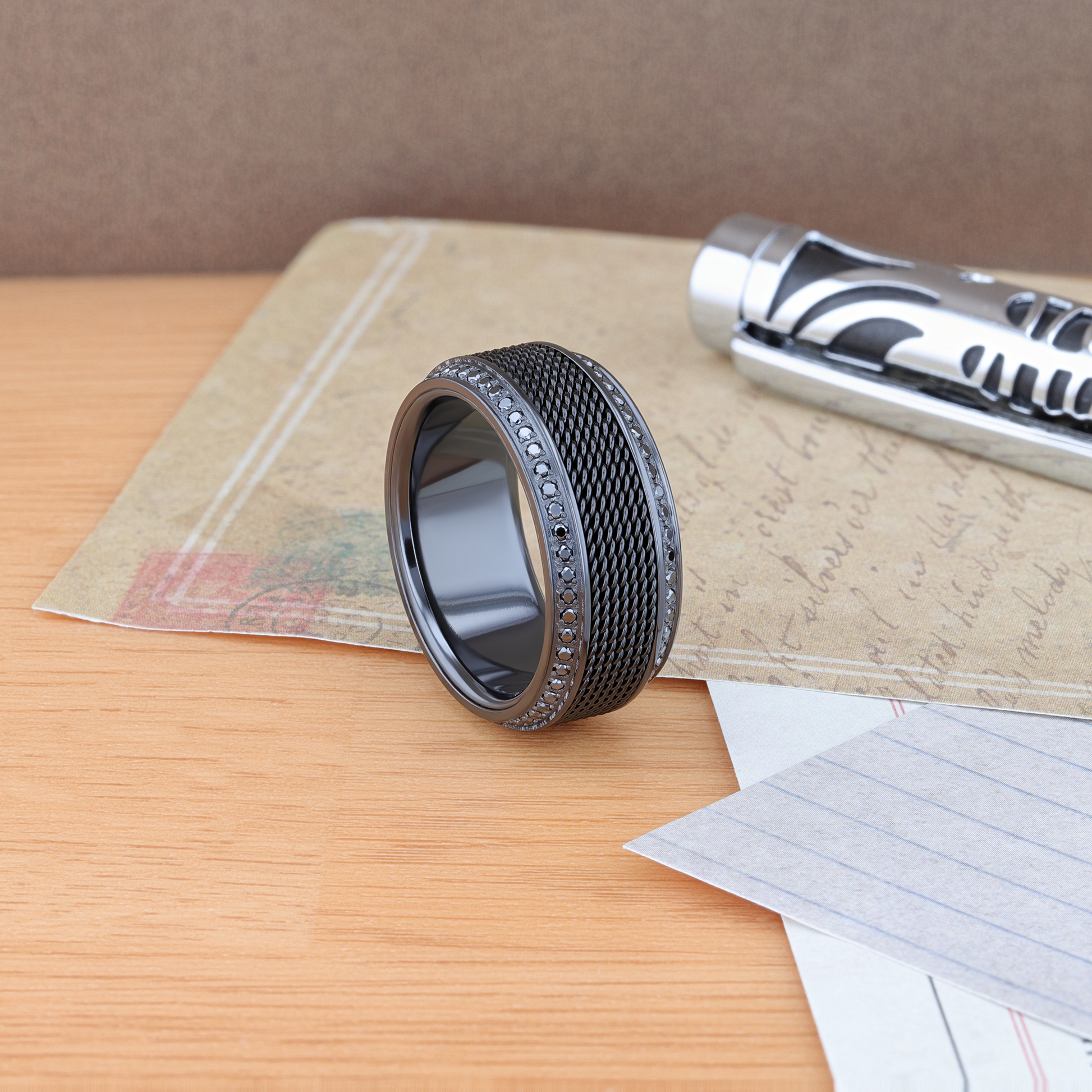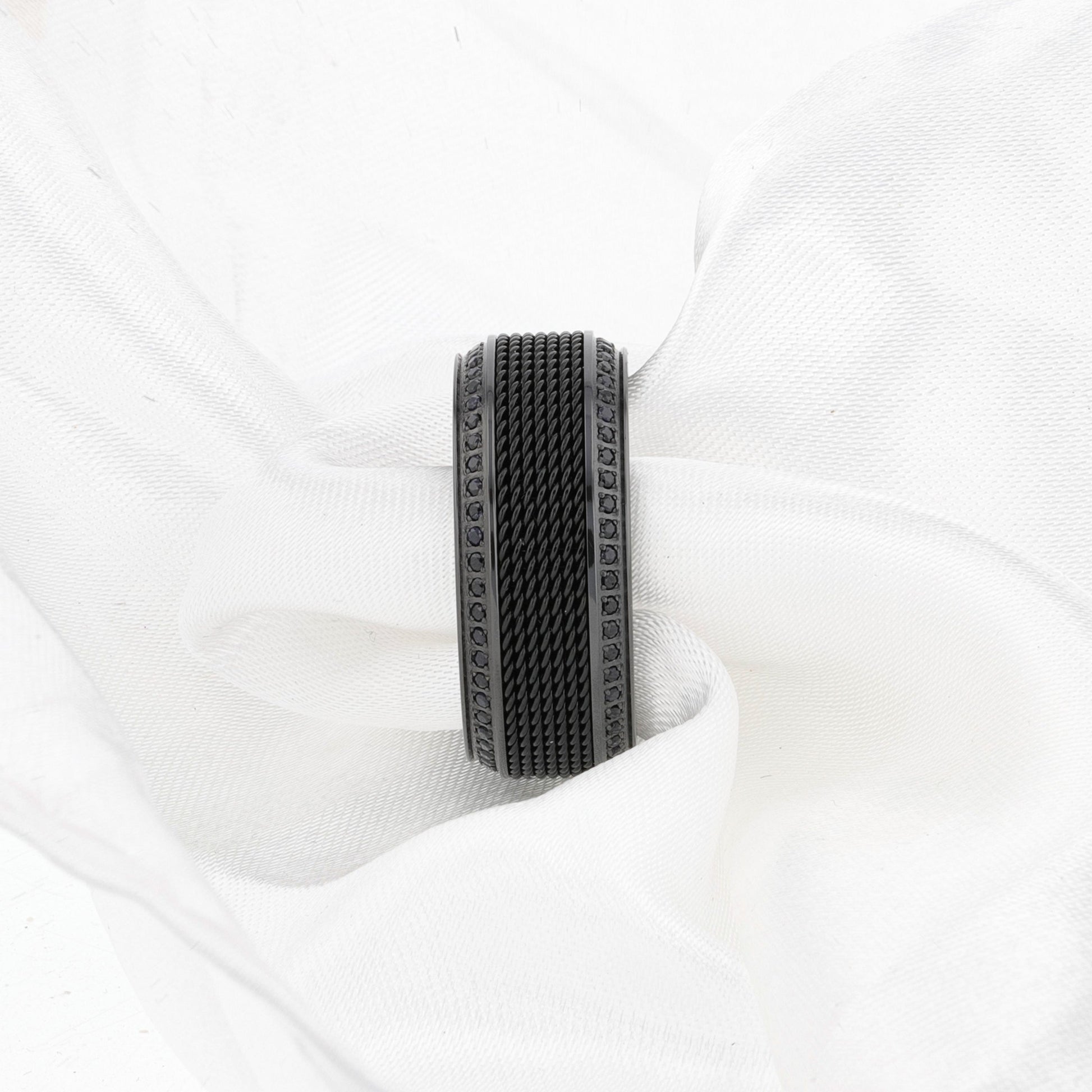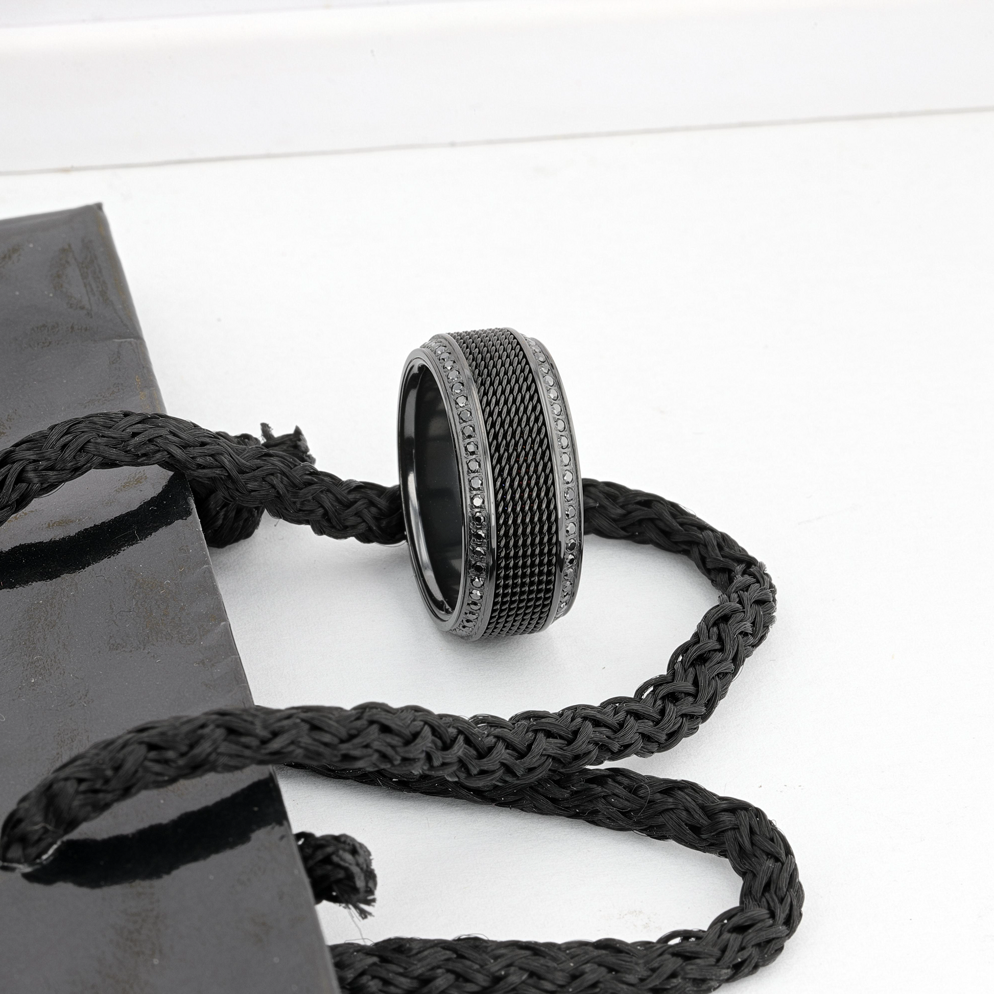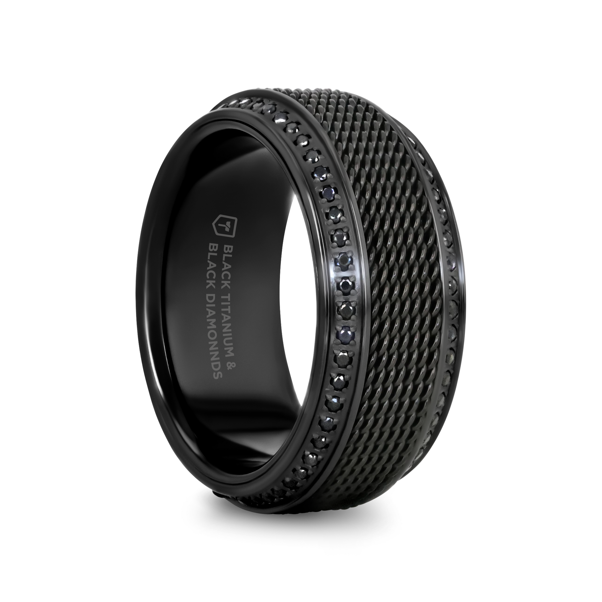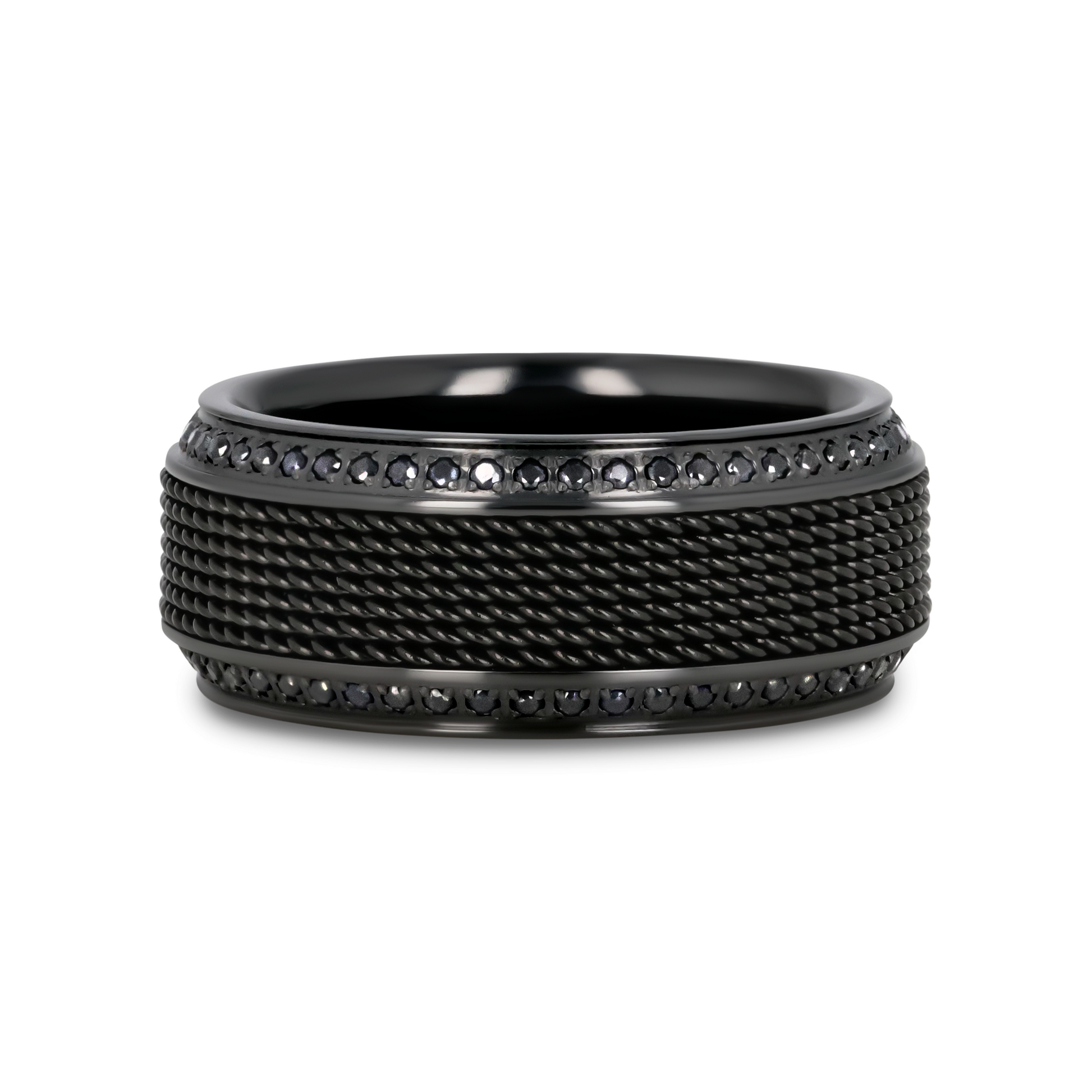 KNIGHT Steel Chain Black Titanium Wedding Ring Polished Beveled Edges Set with Round Black Diamonds - 10mm