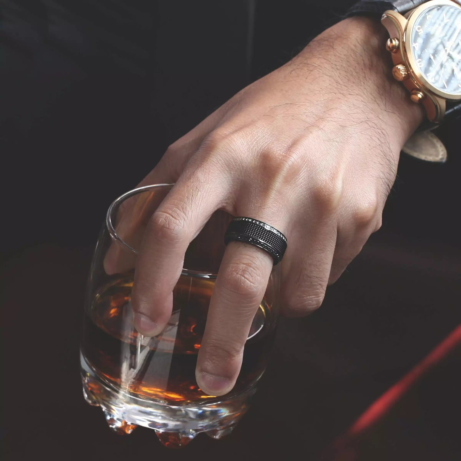Featuring a black steel chain center, KNIGHT is a great choice for individuals who seek a unique band. Featuring 0.5 total carats of black diamonds along the beveled edges of a titanium band, this ring offers exceptional durability to match your lifestyle.