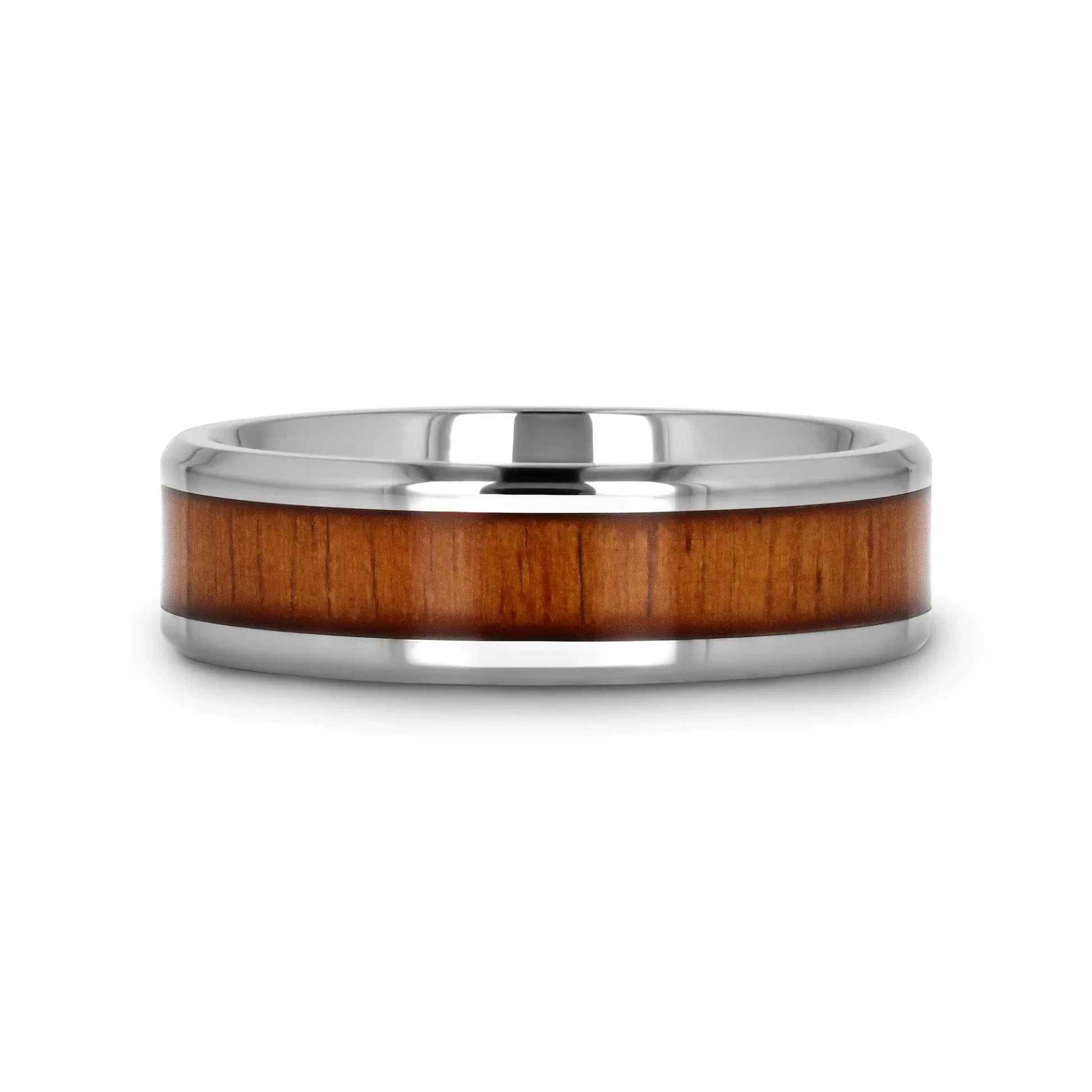 KOAN Titanium Polished Finish Koa Wood Inlaid Men’s Wedding Ring with Beveled Edges - 6mm & 8mm