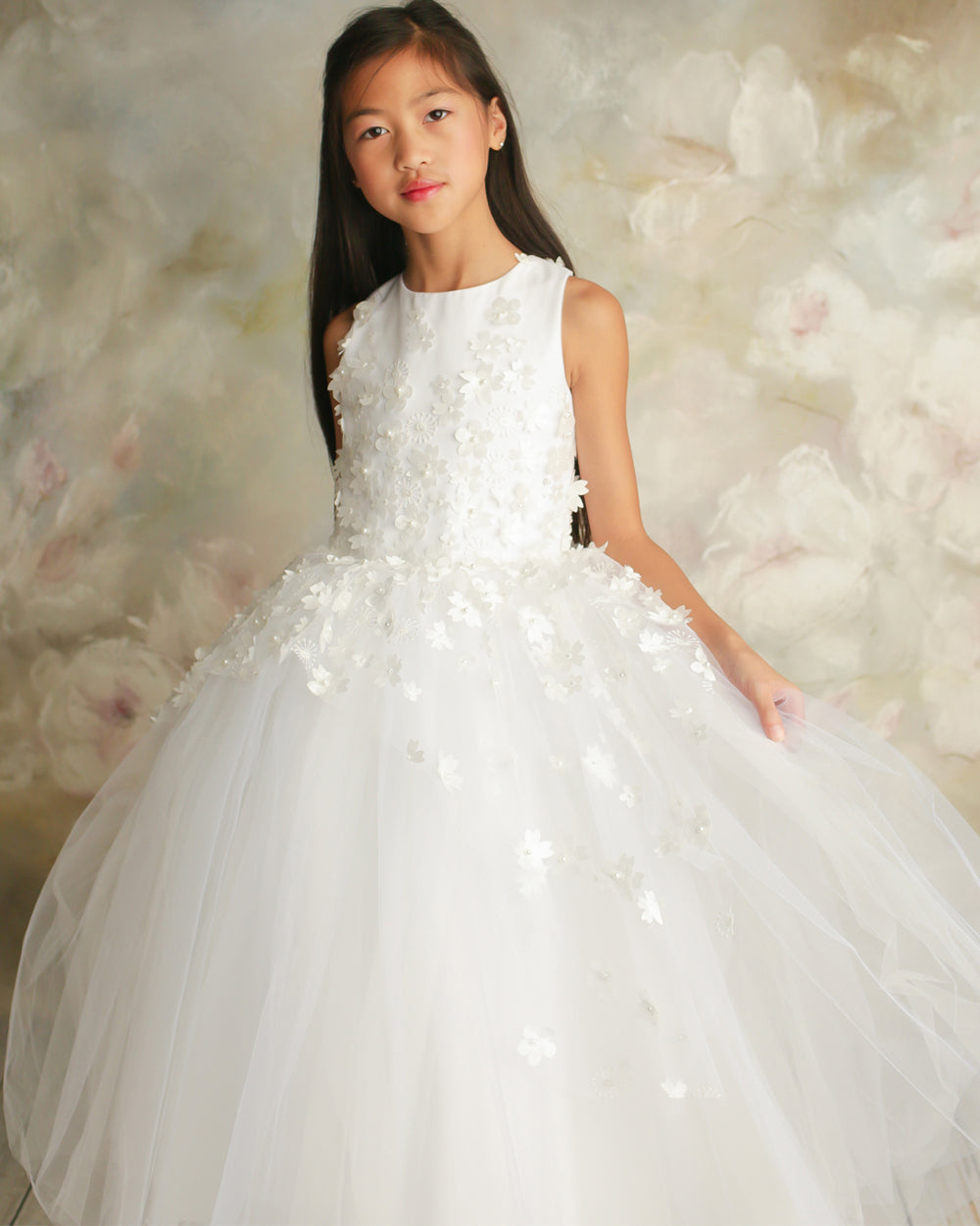 - White Label by Zoe "Lauren" 3D flower embellished tulle dress with ombré peplum overlay.