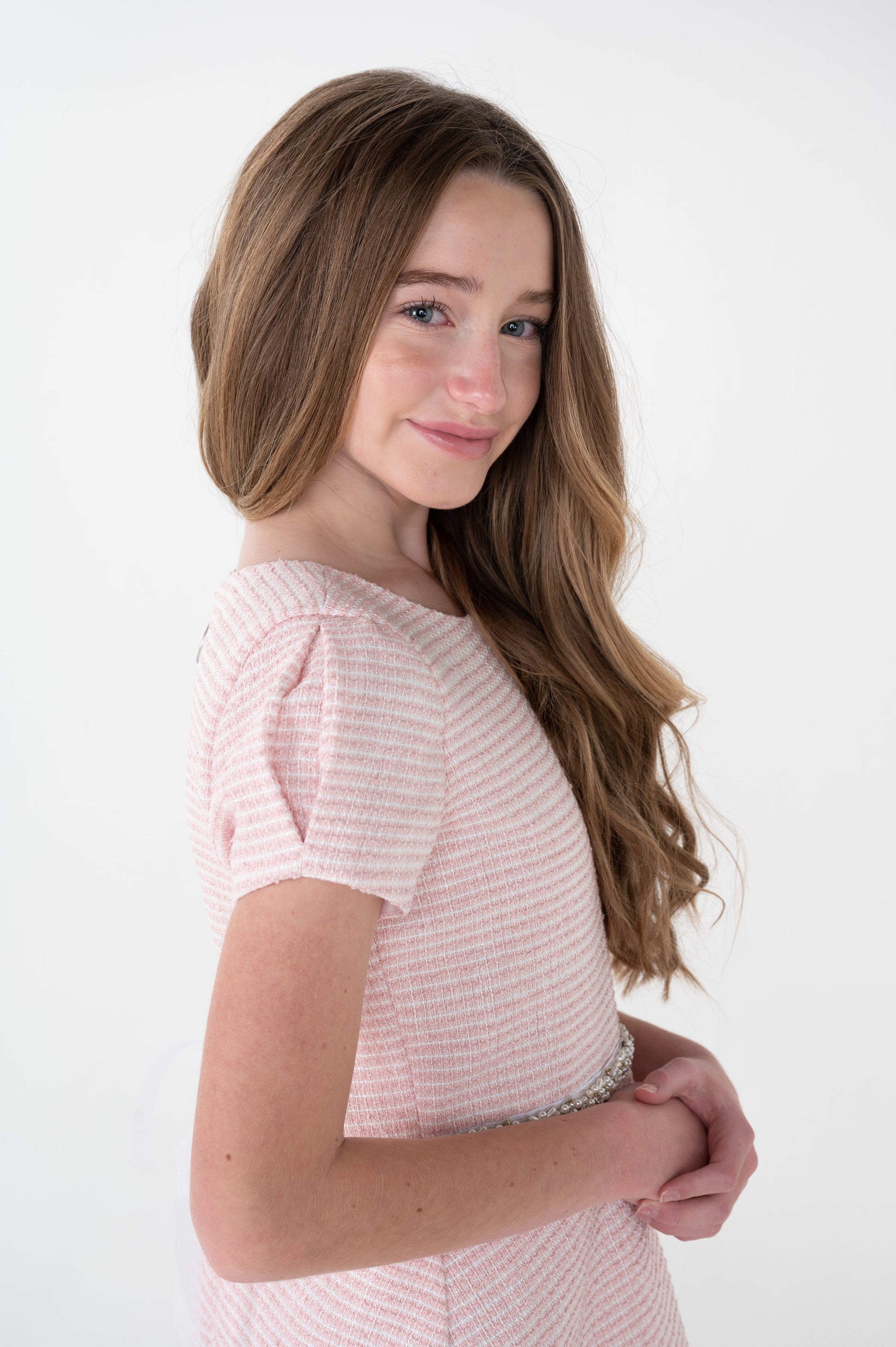 Zoe's metallic tweed dress in a drop-waist silhouette features faux pearls with crystal embellishments and puff sleeves.