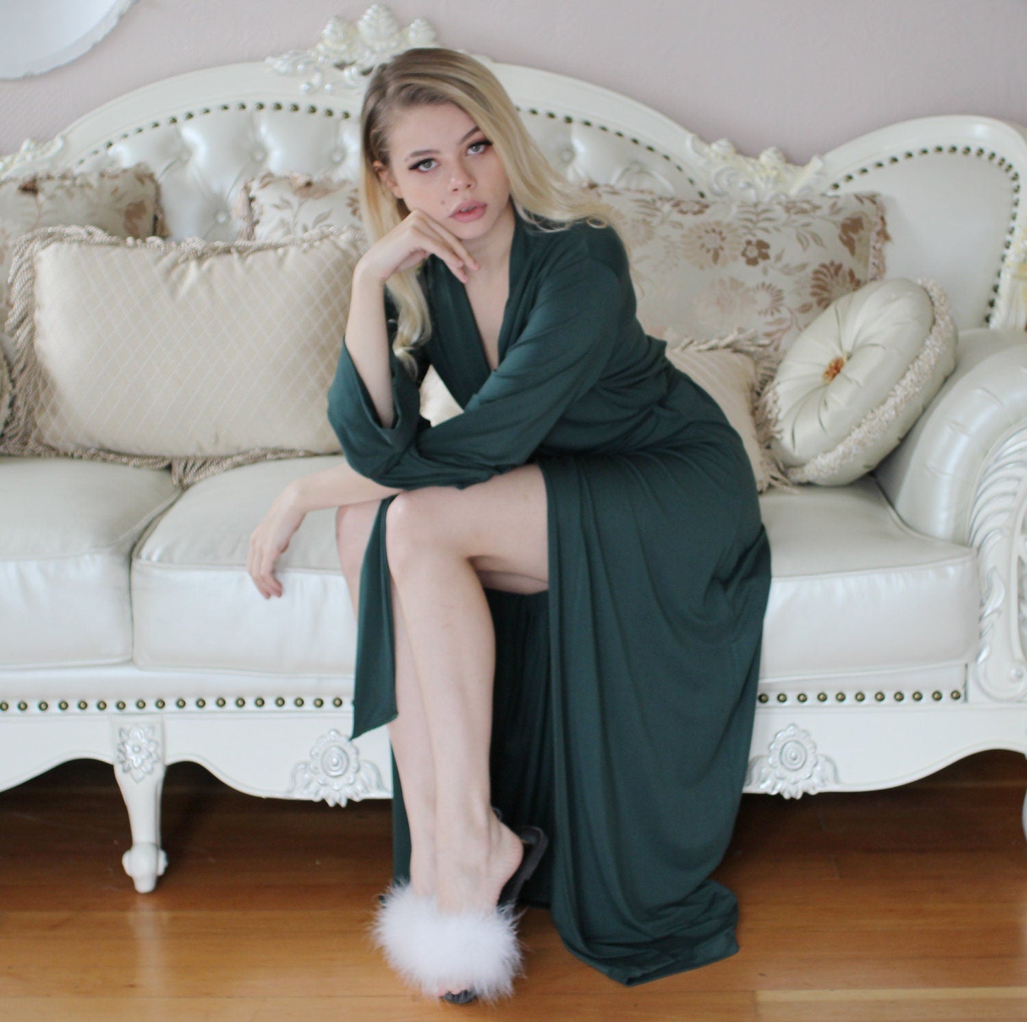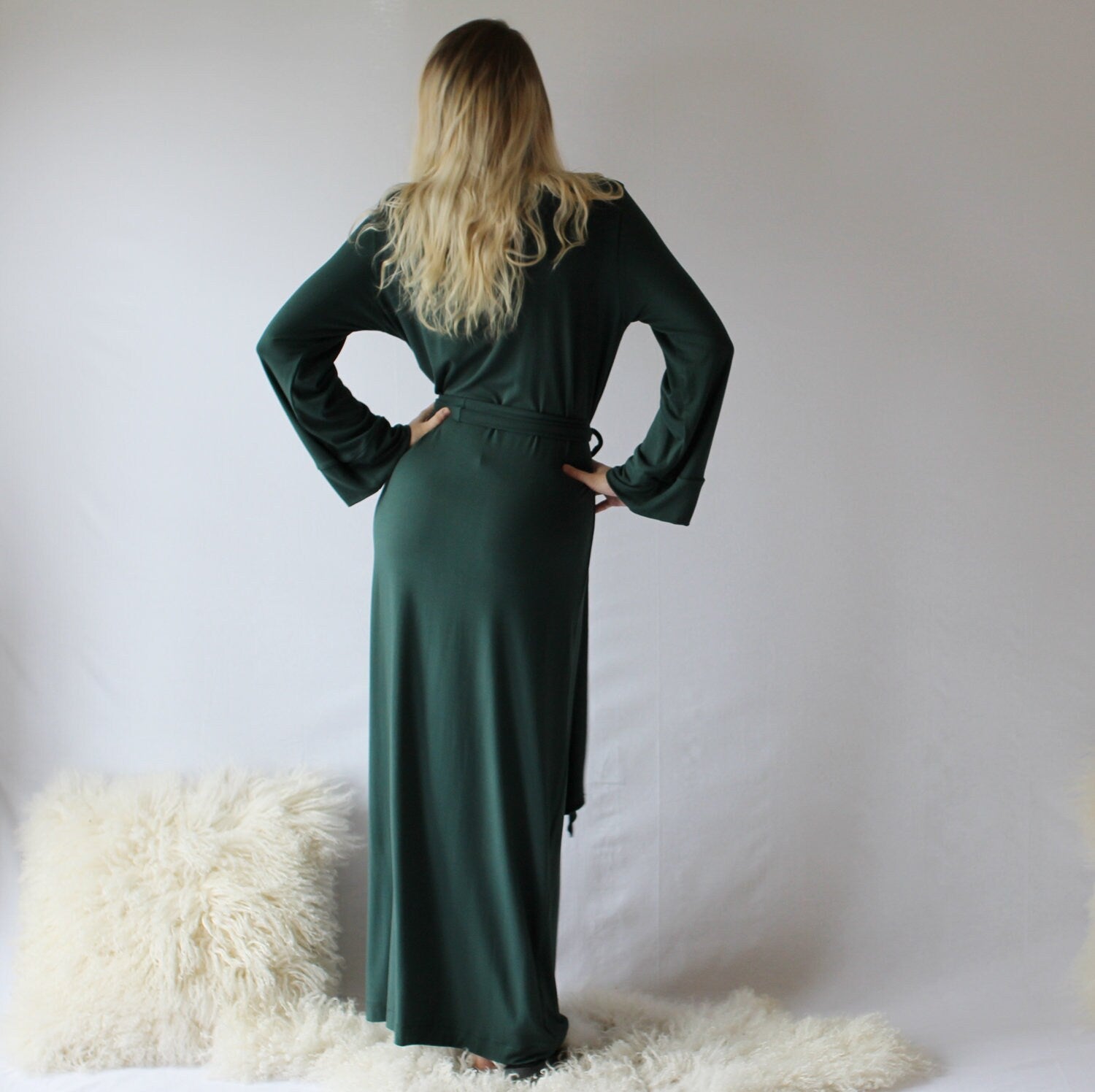 Bamboo robes will both grow up to 10% after hanging and wool robes may shrink 10% with production depending on the color. Please note that particularly with knit garment lengths it will never hit at exactly the same place as the model, nor will it fit exactly as it does on the model even when it is cut to the same size since every body is different.