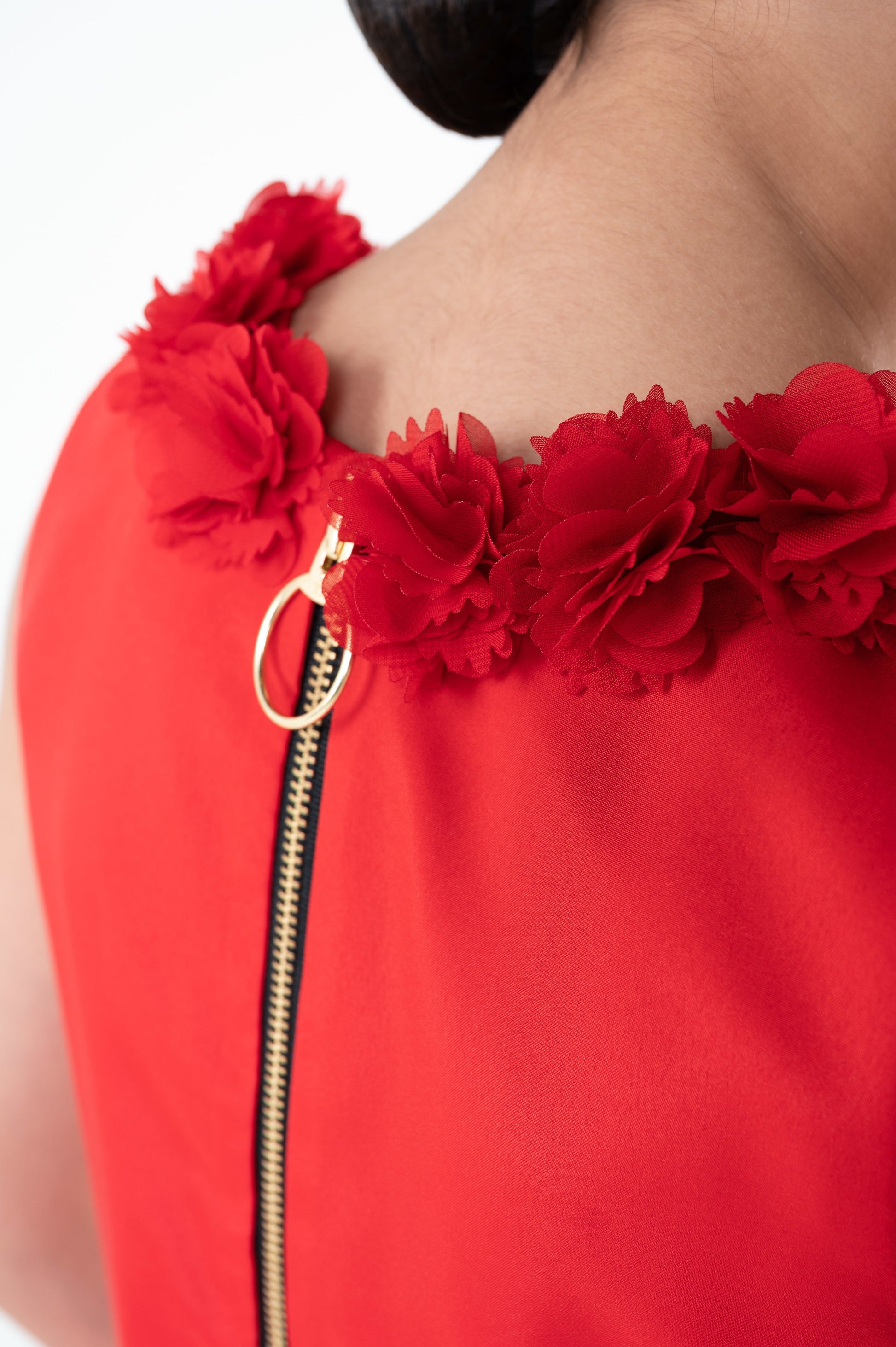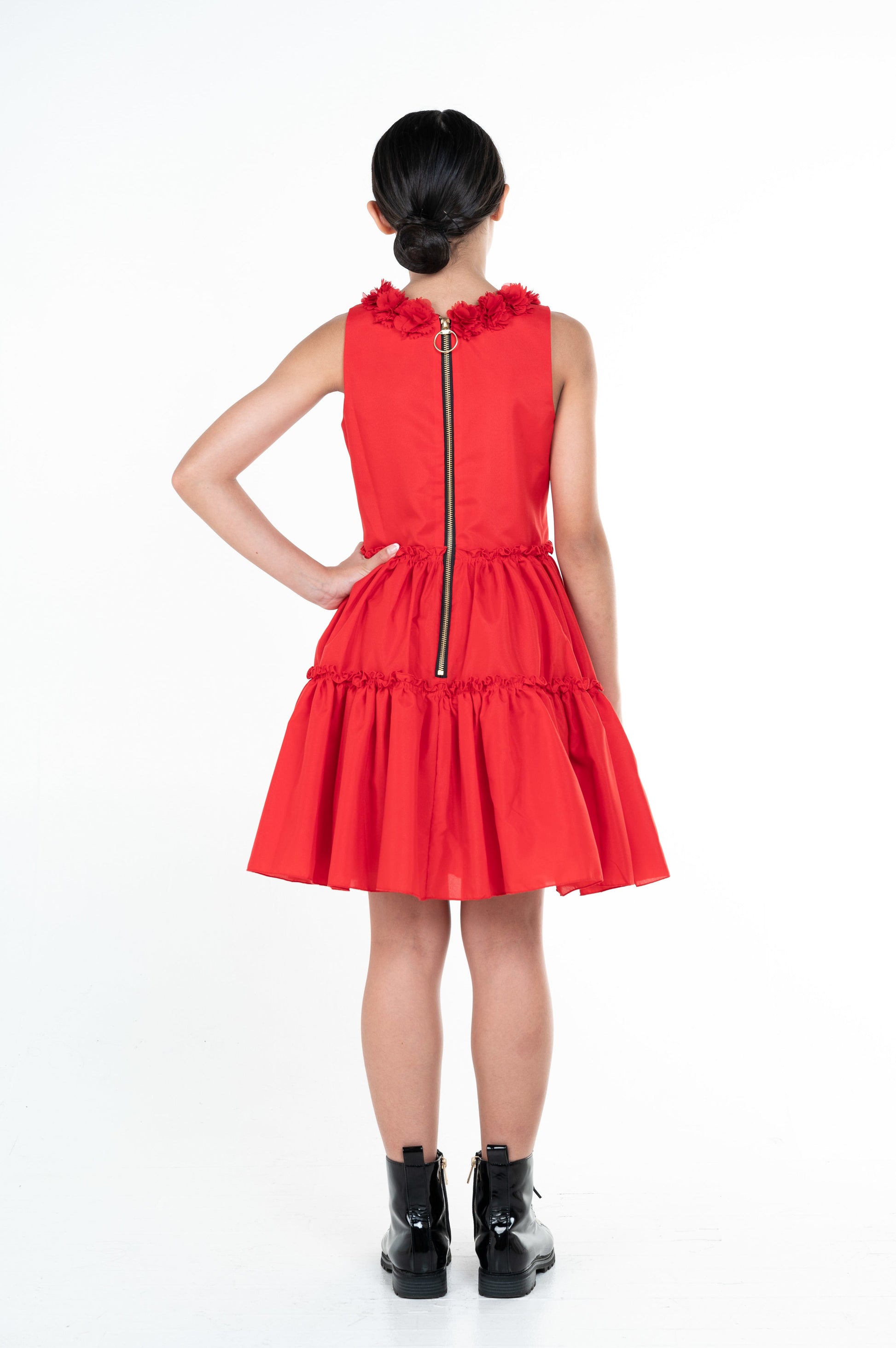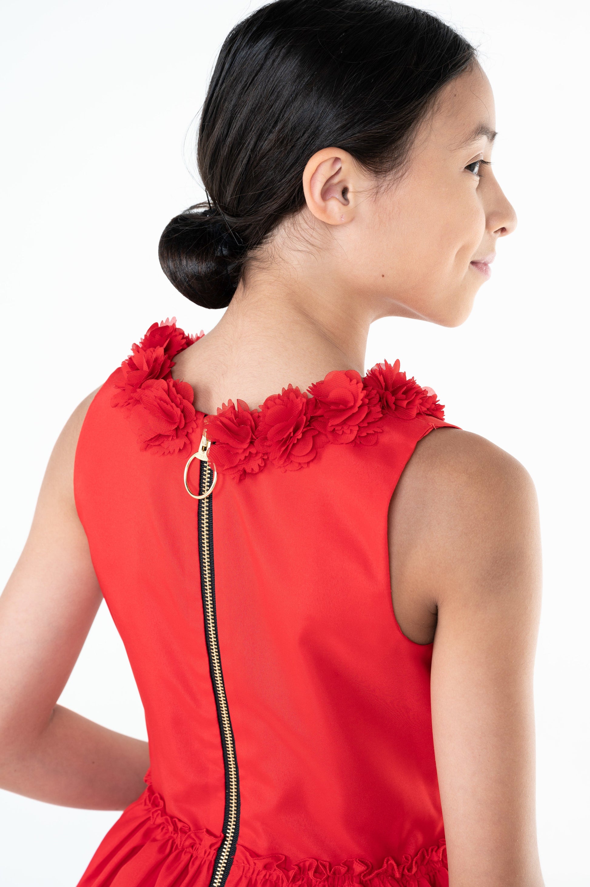 - Zoe "Madelyn" tiered dress features 3D flower trim at neckline