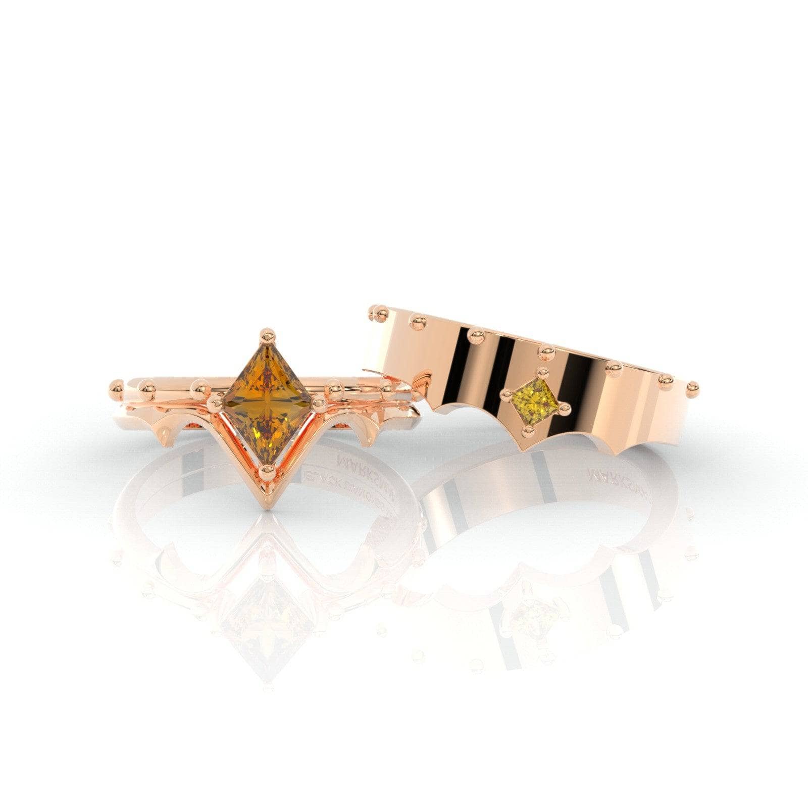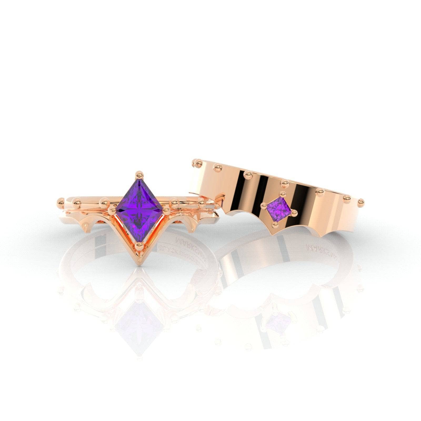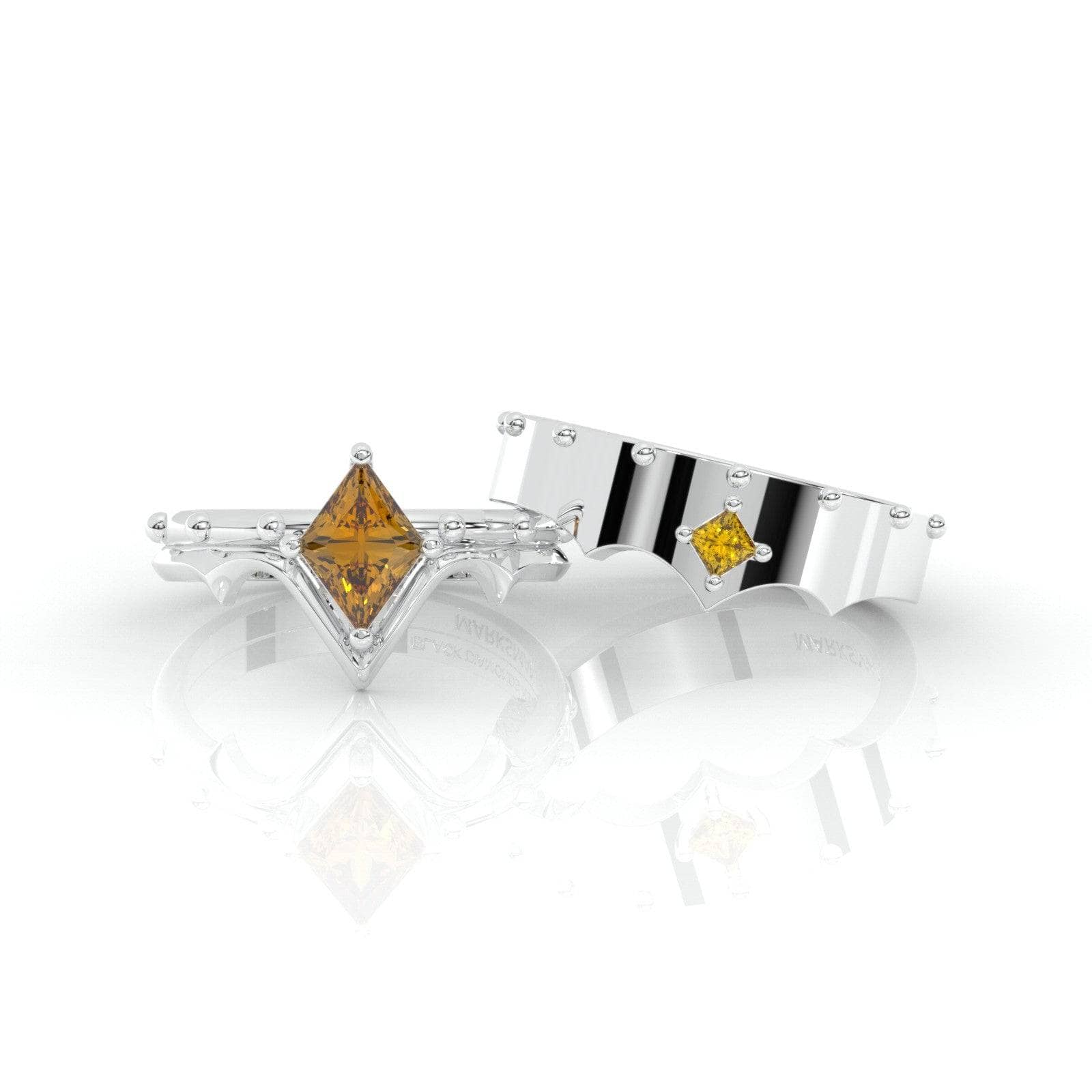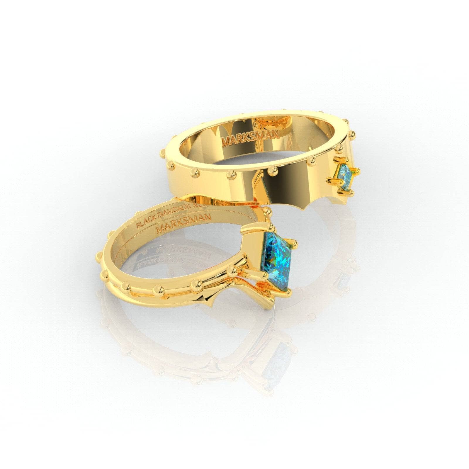 A set that compliments your Marksman Unisex Ring is here! Inspired by your favorite character's unique mechanics and strengths. Exclusively designed and set with our custom elongated princess-cut center stone. Set in a durable unique band with studs that symbolizes strength, protection, and love. With a killer shot and a killer ring, you will definitely win over the woman of your dreams!