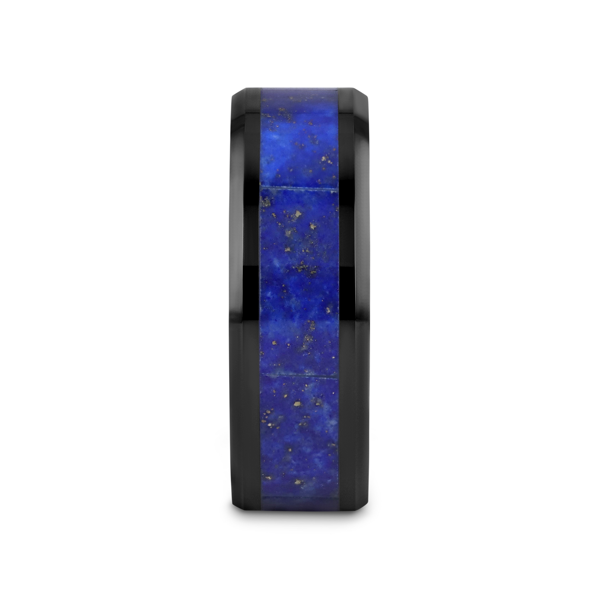 MARLOW Men’s Polished Black Ceramic Wedding Band with Blue Lapis Inlay & Beveled Edges - 8mm
