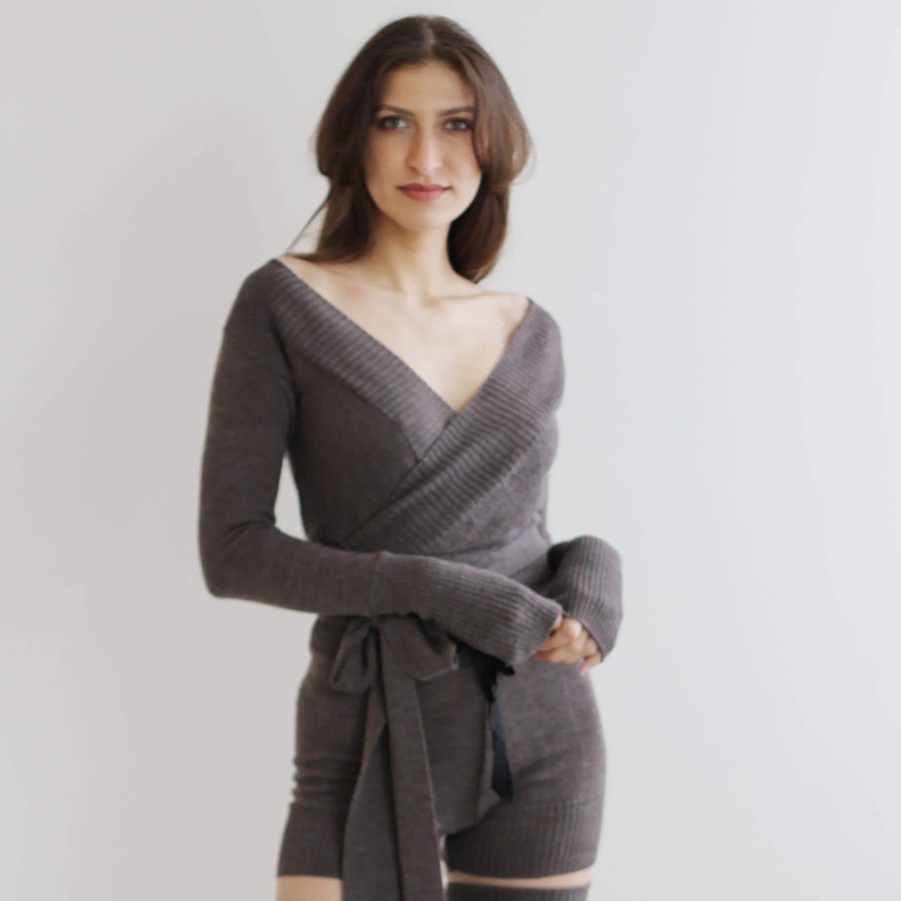 Features long double knit ties, off the shoulder ribbed neckline and long fitted sleeves.