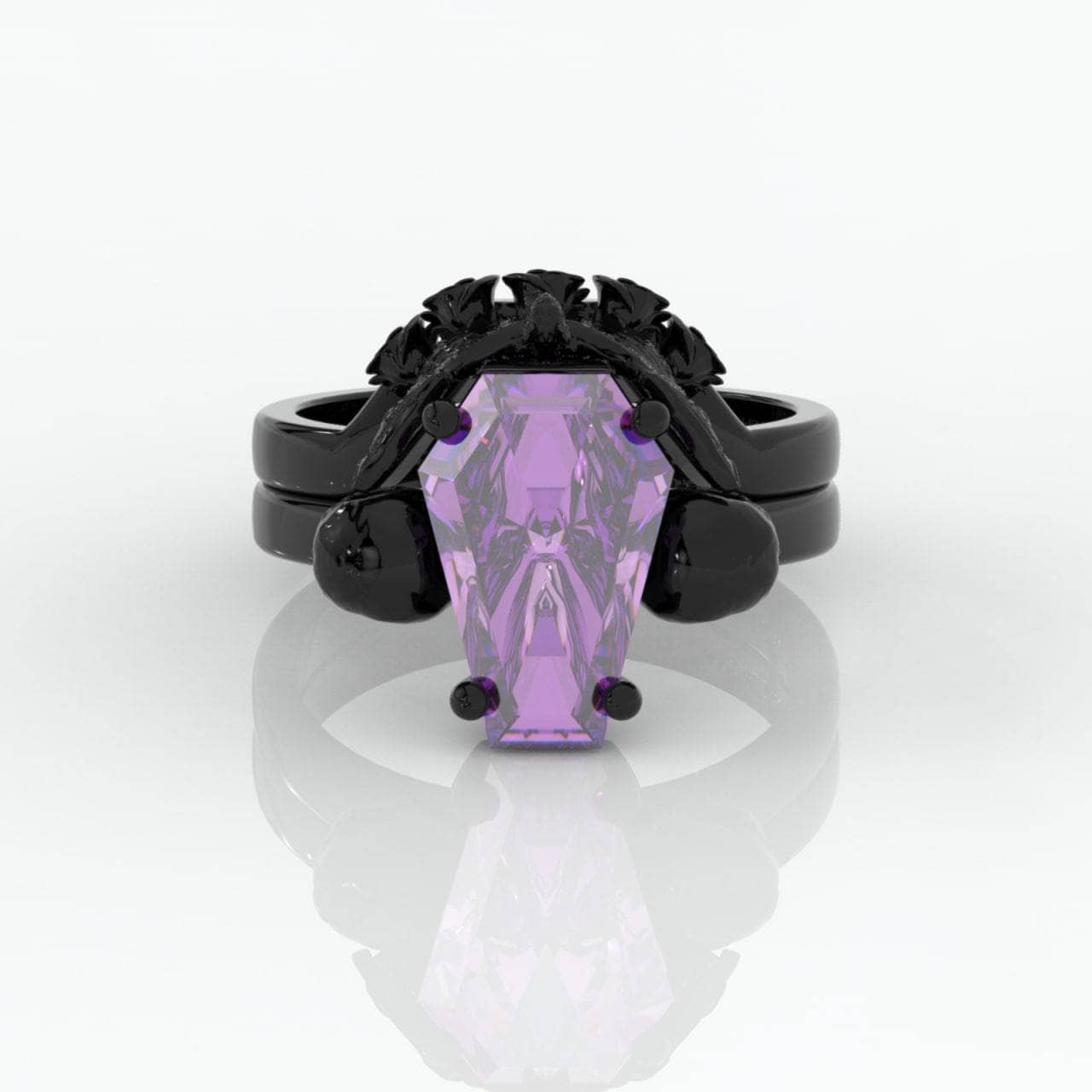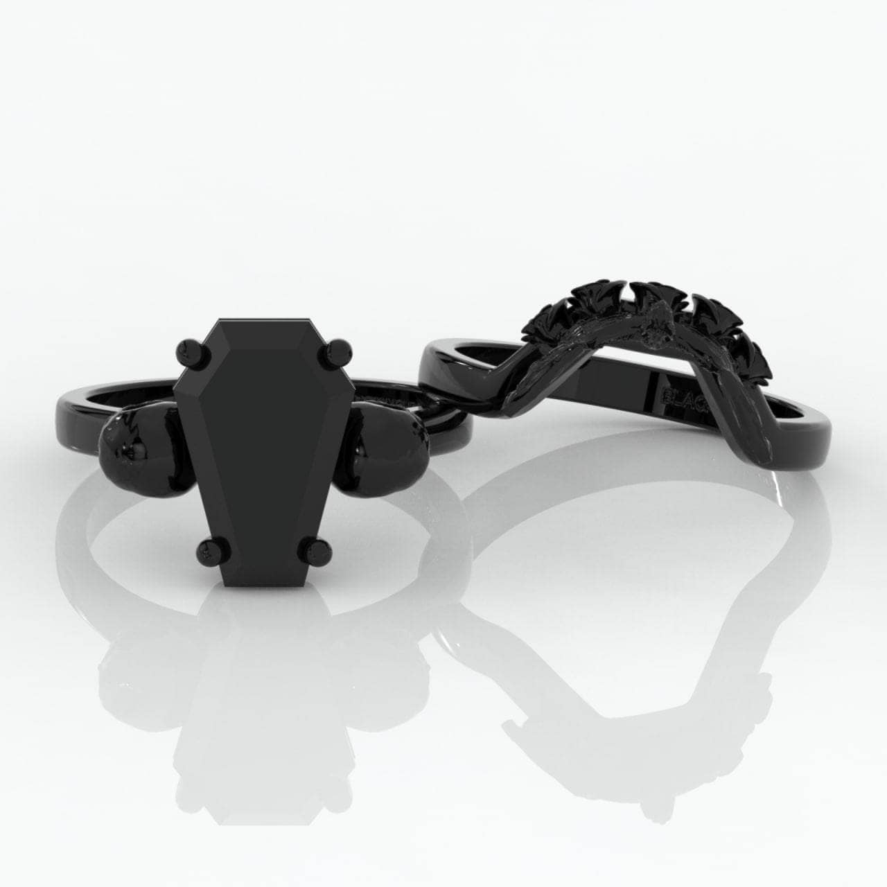 A love born in shadows, destined for eternity. Our "My Ever After" rings, forged in the depths of a shared soul, tell a tale of undying devotion. The dark allure of the black finish embraces a coffin-cut gemstone, guarded by symbolic skulls, while a band of black diamonds whispers of endless nights. The accompanying ring, a thorny embrace of roses, intertwines fate. This intricate design, a testament to a bond unbreakable by time or even death, is more than jewelry—it is a promise of forever in the velvet darkness.