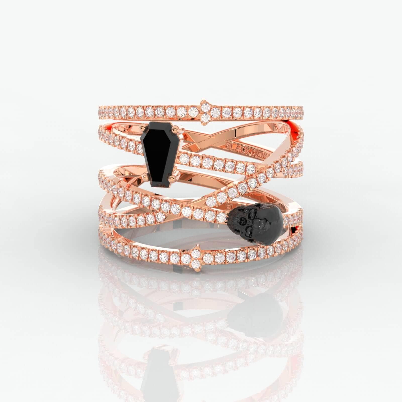 A love so deep it feels as though two souls, once separated, have found their way back to one another. Our "My Other Half" rings, a tribute to this profound connection, are forged from the warm embrace of 14K rose gold. The intricate design features a magnificent coffin-cut diamond, an unconventional shape for a love that defies all norms, while its intricate band is adorned with smaller brilliant diamonds, sparkling like starlight in a midnight sky. This collection is for those who are each other's missing piece, a promise that a love this true is meant to be together for all of eternity.